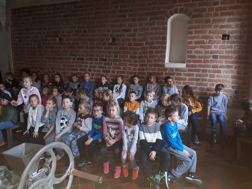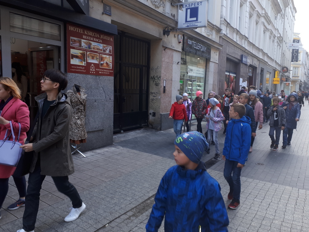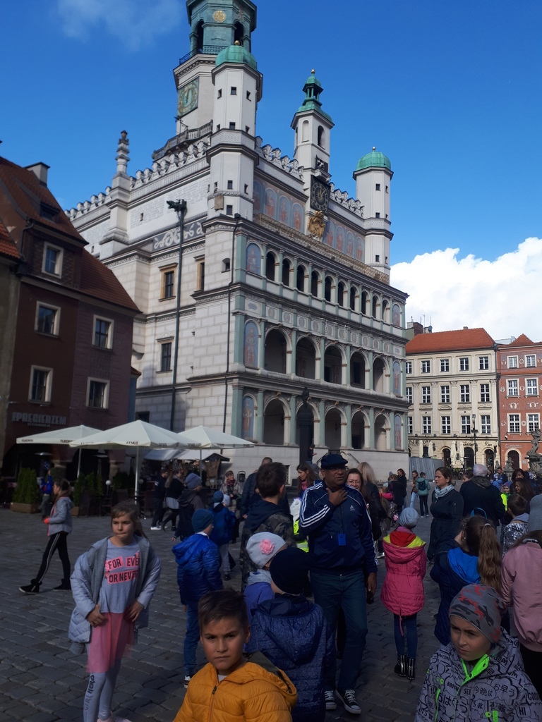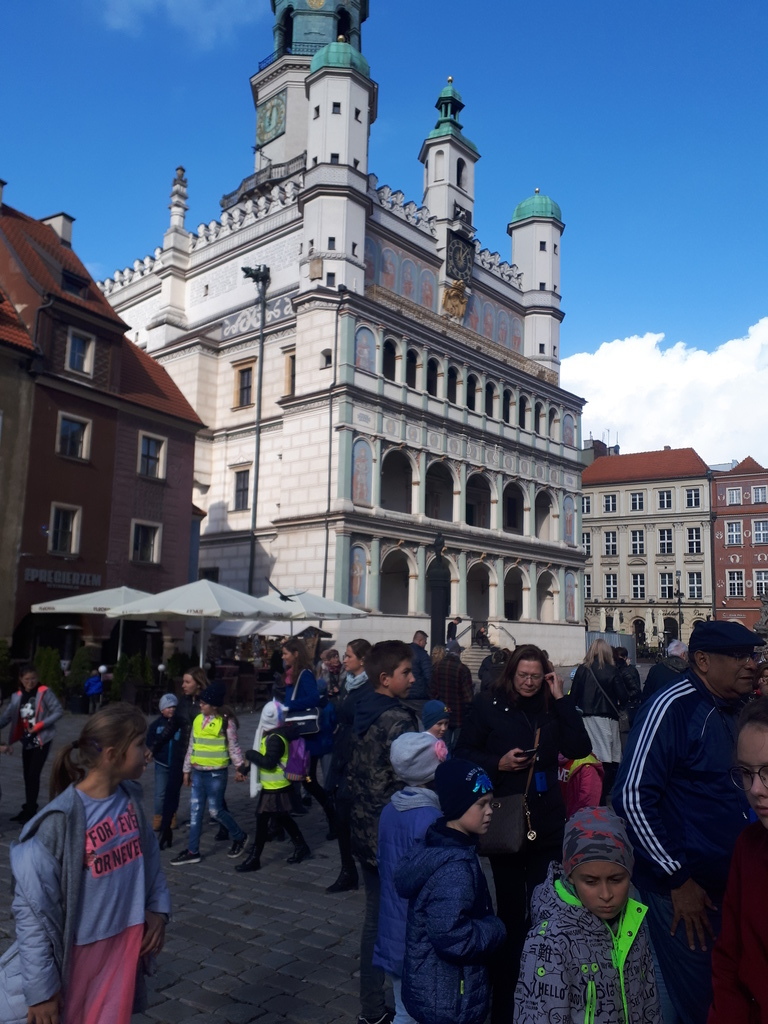 W środę 9 października 2019r. wyjechaliśmy do Poznania na spektakl pt. „Koziołek Matołek i zagadka ratuszowej wieży”. Historia była opowieścią o tym, jak znany dzieciom podróżnik - Koziołek Matołek, w towarzystwie Poznańskiej Pyry i Rogala wyruszył w podróż po Polsce w poszukiwaniu swoich kuzynów - koziołków, które uciekły z poznańskiej ratuszowej wieży. Bohaterowie spektaklu przenosili się w kolejne miejsca dzięki guzikom teleportacji. Podróż ich była okazją do poznawania wielu ciekawych zakątków Polski, a przede wszystkim pieśni ludowych z różnych regionów naszej ojczyzny oraz tańców narodowych. W przedstawieniu zobaczyliśmy między innymi: wielkopolski taniec Marynia, Krakowiak i Polonez; były tańce góralskie oraz tańce kaszubskie. Można było zauważyć, że spektakl zrobił na dzieciach ogromne wrażenie. Ujmował kolorowymi strojami tancerzy, melodyjnymi piosenkami współczesnymi i dynamiczną fabułą. Po spektaklu wszyscy uczniowie pod opieką wychowawców: p. W.Mataczyńskiej, p. E.Wawrzyk, p. E.Walkowiak oraz p. A.Waseli i p. M.Chruściel udali się na poznański Rynek, by w samo południe zobaczyć słynne koziołki na wieży poznańskiego Ratusza. Uczniowie gościli także w Rogalowym Muzeum Poznania, gdzie poznawali tajniki przygotowywania tradycyjnych rogali świętomarcińskich, a w dowód uznania otrzymali pamiątkowe certyfikaty czeladnicze.