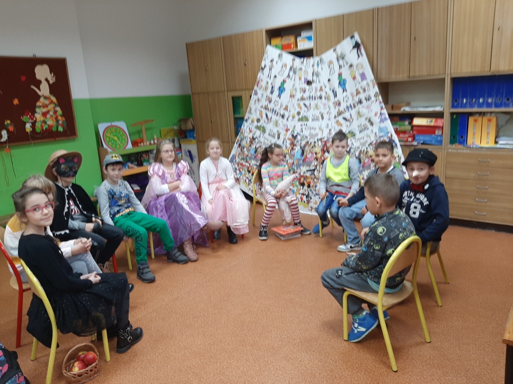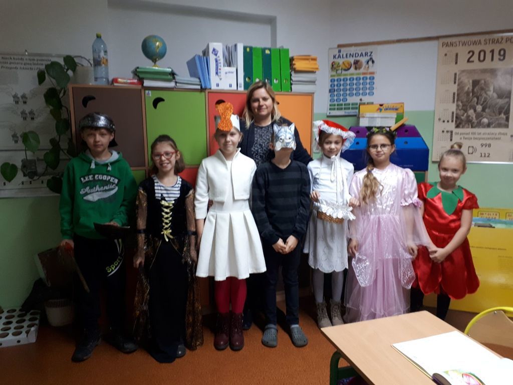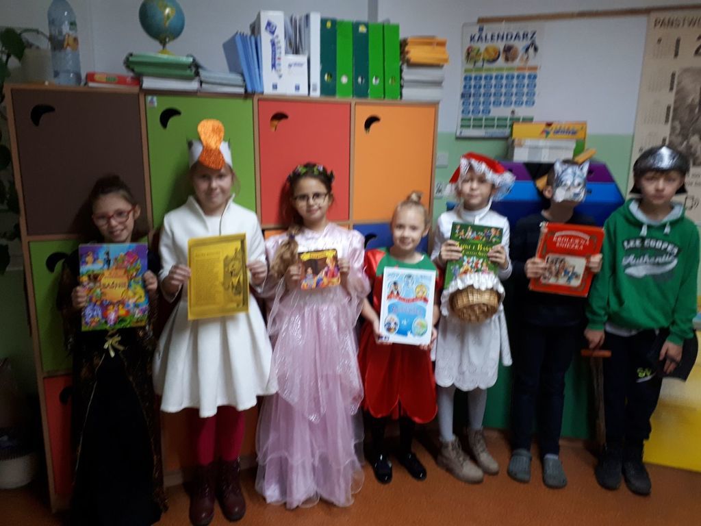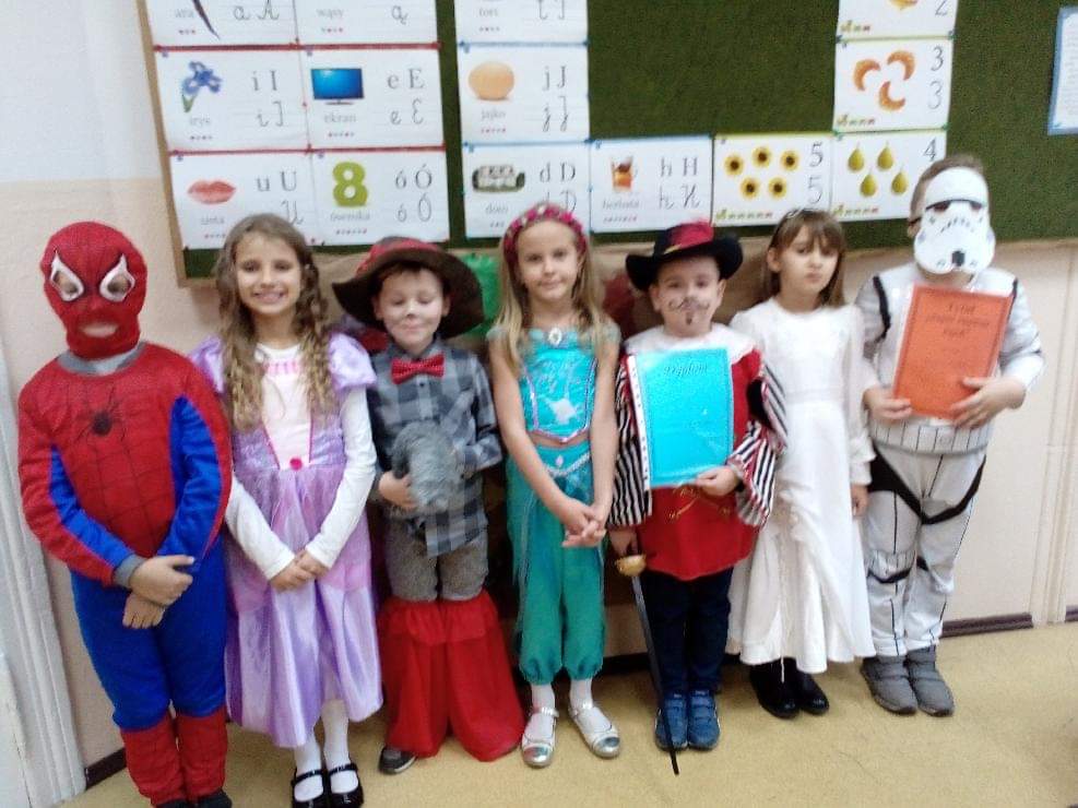 Dzień Postaci z Bajek, którego organizatorami dnia 5.11.2019r. byli wychowawcy klas I-III oraz wychowawczyni oddziału przedszkolnego przyniósł uczniom wiele atrakcyjnych działań edukacyjnych. Tego dnia odbył się konkurs na najciekawsze przebranie oraz o tytuł „Super Znawca Bajek”. Były zabawy wymagające wykazania się znajomością treści bajek, dzieci rozwiązywały zagadki, rozpoznawały bajki po rekwizycie lub po przeczytaniu fragmentu książki. Nie zabrakło zabaw muzyczno-ruchowych. Dzień ten był wspaniałą okazją do pięknego czytania fragmentów bajek, ich inscenizowania oraz zabaw tematycznych związanych z ulubionymi postaciami literackimi uczniów. Okazało się, że dzieci bardzo dobrze znają bajki i świetnie potrafią radzić sobie z różnymi zadaniami opartymi na ich treści.