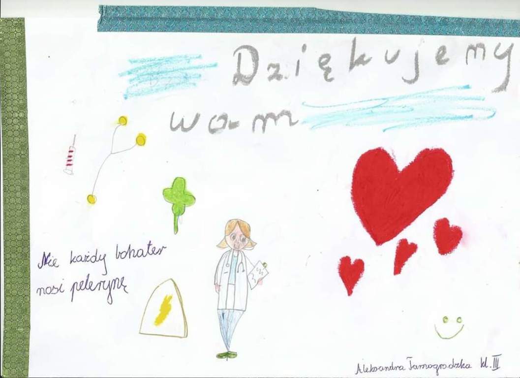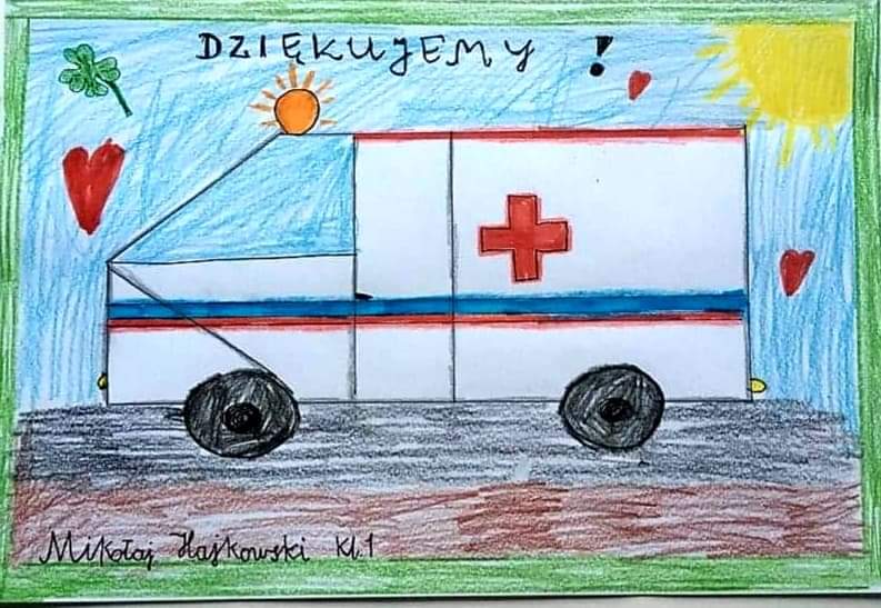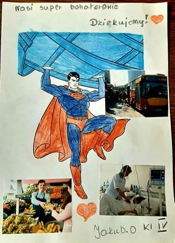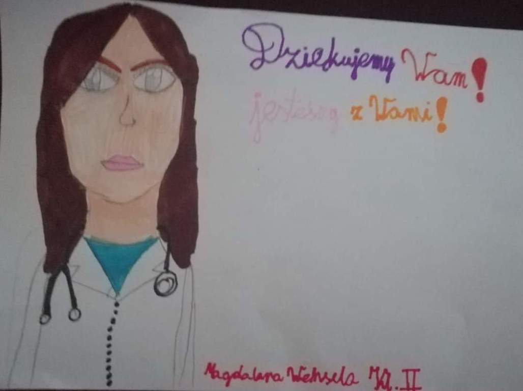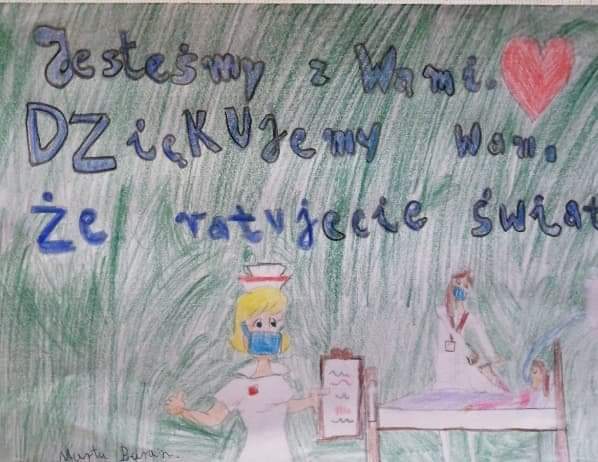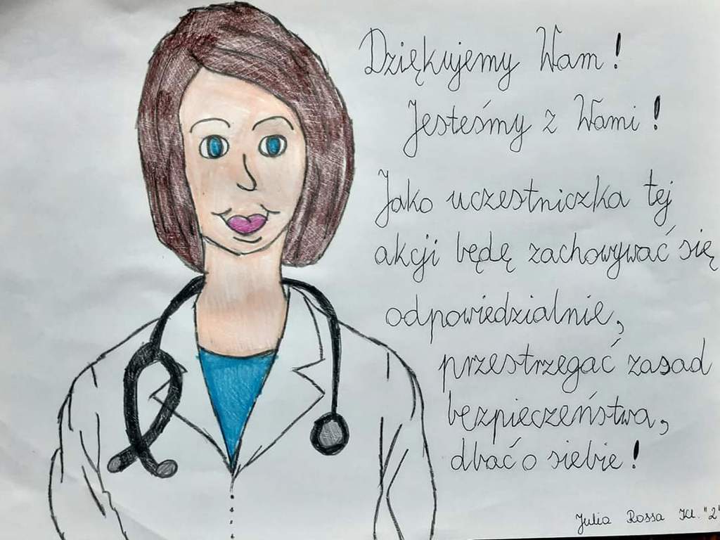 Pierwsi uczniowie naszej szkoły udostępnili do obejrzenia innym swoje kolorowe rysunki - podziękowania, niosące wsparcie lekarzom, ratownikom medycznym, pielęgniarkom, diagnostom oraz żołnierzom, strażakom, sprzedawcom w sklepach, kierowcom autobusów, czyli tym wszystkim, którzy niosą pomoc społeczeństwu w trudnym czasie epidemii. Ciężko pracujące służby bardzo tego wsparcia potrzebują, dlatego serdecznie w ich imieniu dziękujemy za każdą wykonaną i udostępnioną pracę.
