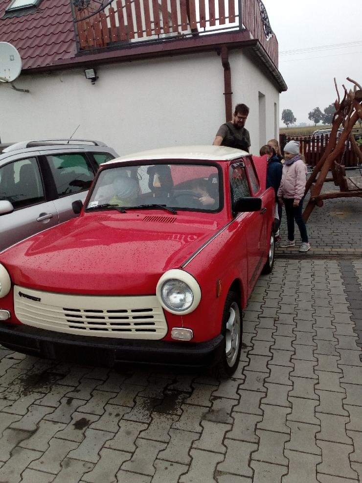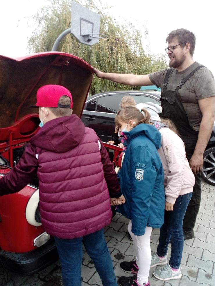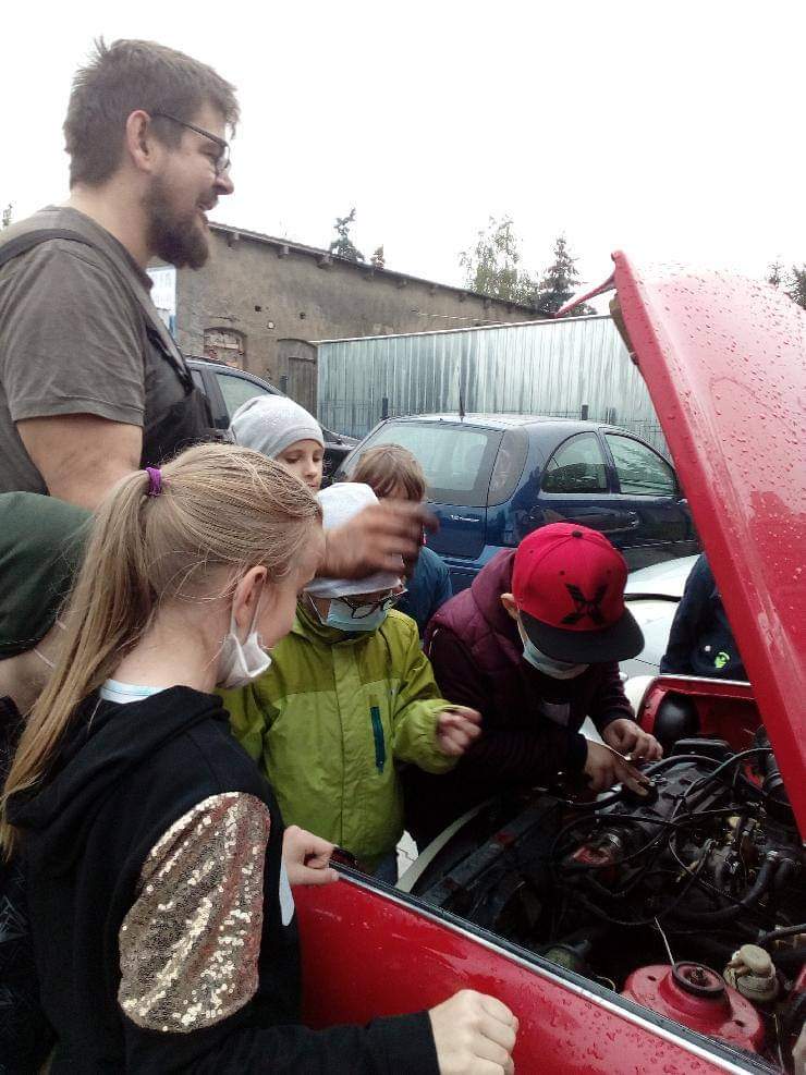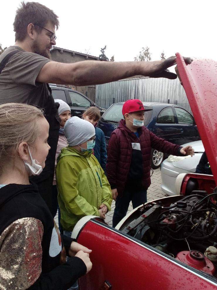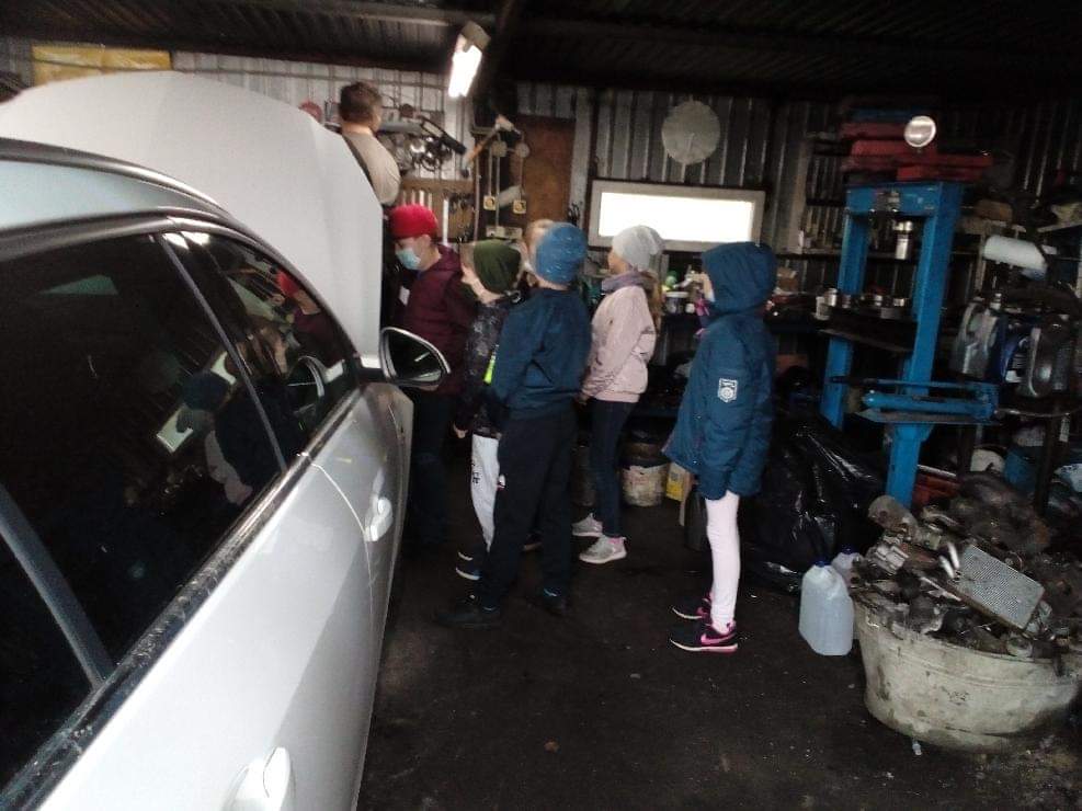 Uczniowie klasy drugiej podczas wycieczki poznawali zawód wykonywany przez tatę Marysi-uczennicy klasy drugiej, który jest mechanikiem samochodowym.