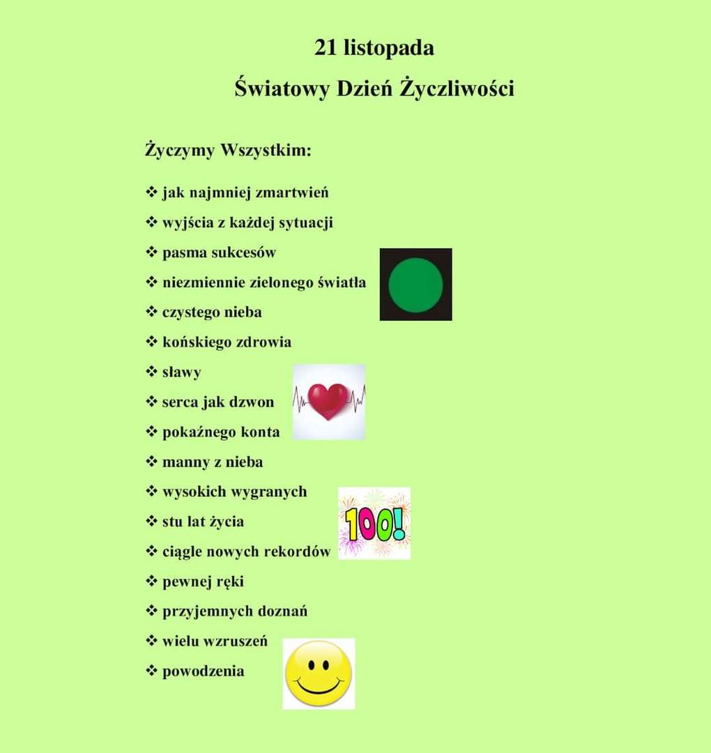21 listopada to Dzień Życzliwości. Kogo możemy nazwać życzliwym człowiekiem? Życzliwy człowiek szanuje innych ludzi. Jest miły i chętny do niesienia pomocy, stara sie zrozumieć drugiego człowieka, potrafi doradzać w trudnych chwilach. Jest szczery, dyskretny, wyrozumiały. Życzliwy człowiek nie dokucza innym, nie wyśmiewa, nie obgaduje. Ma dobre serce. W jego towarzystwie zawsze czujemy się dobrze i bezpiecznie. Każdy może być życzliwy. Życzliwość nic nie kosztuje..., a jest bezcenna.