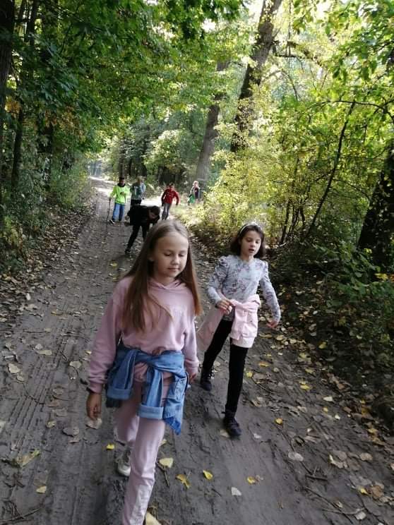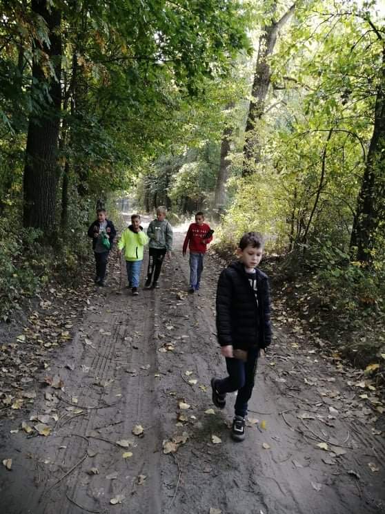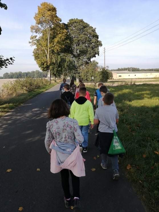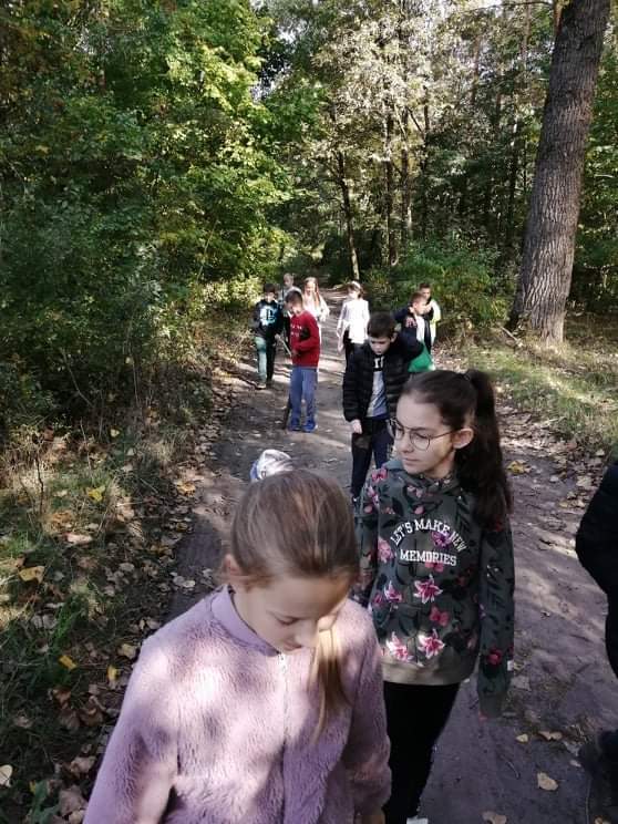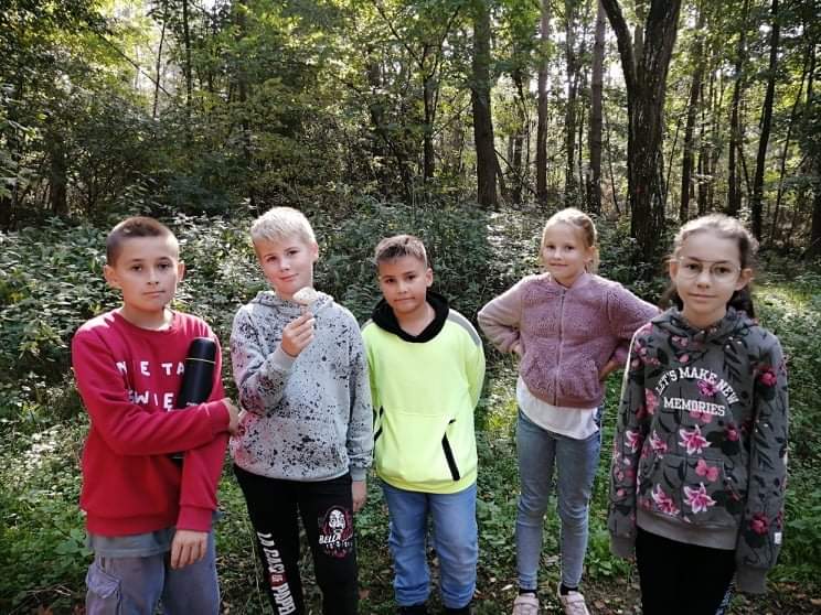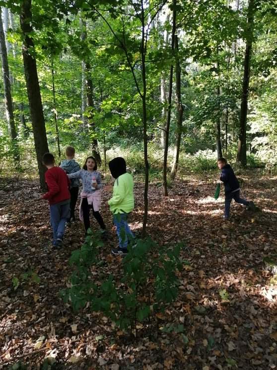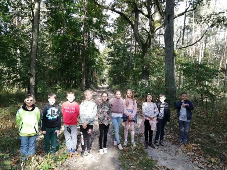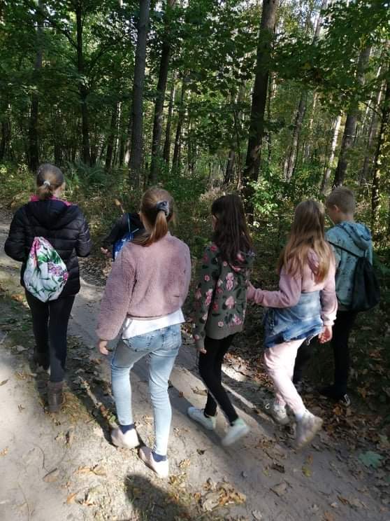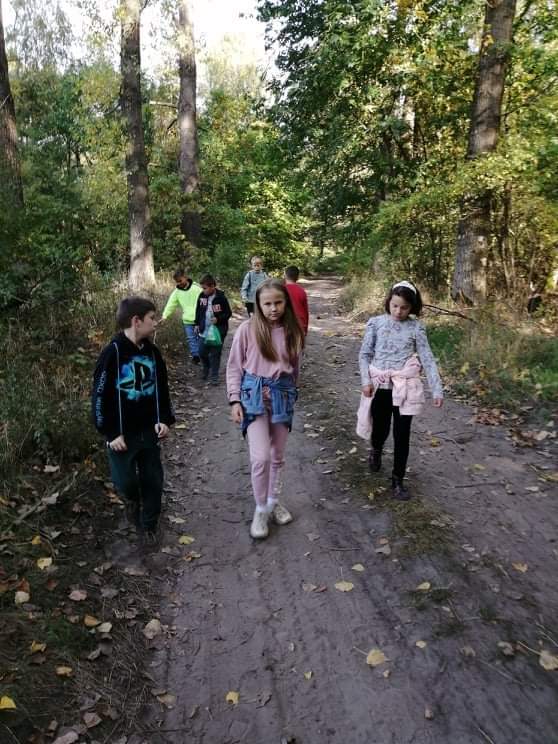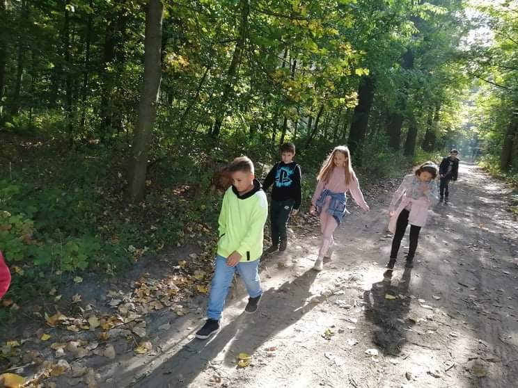 Uczniowie klasy IV wzięli udział w pieszej wycieczce do lasu, podczas której podziwiali i obserwowali las w jesiennej szacie.