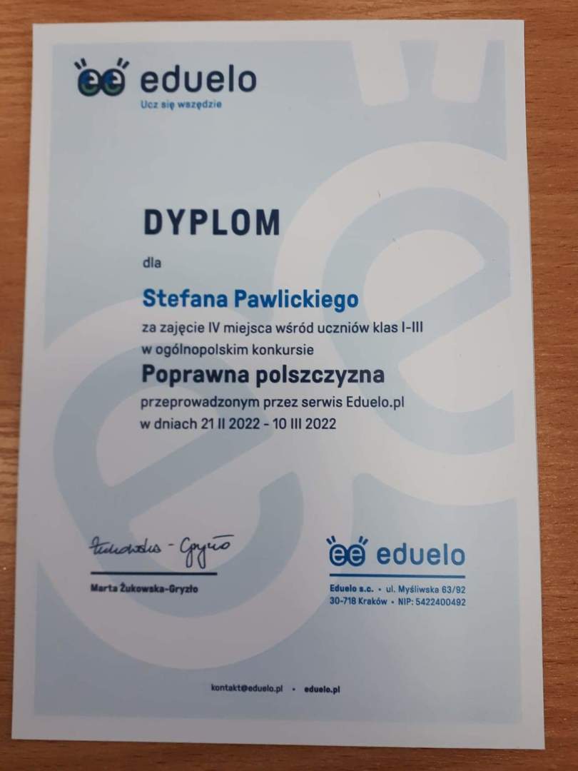 Z radością informujemy, że Stefan Pawlicki - uczeń klasy 2 naszej szkoły zajął IV miejsce wśród uczniów klas I-III w ogólnopolskim konkursie "Poprawna polszczyzna" przeprowadzonym na platformie Eduelo.pl. Brawo Stefan!