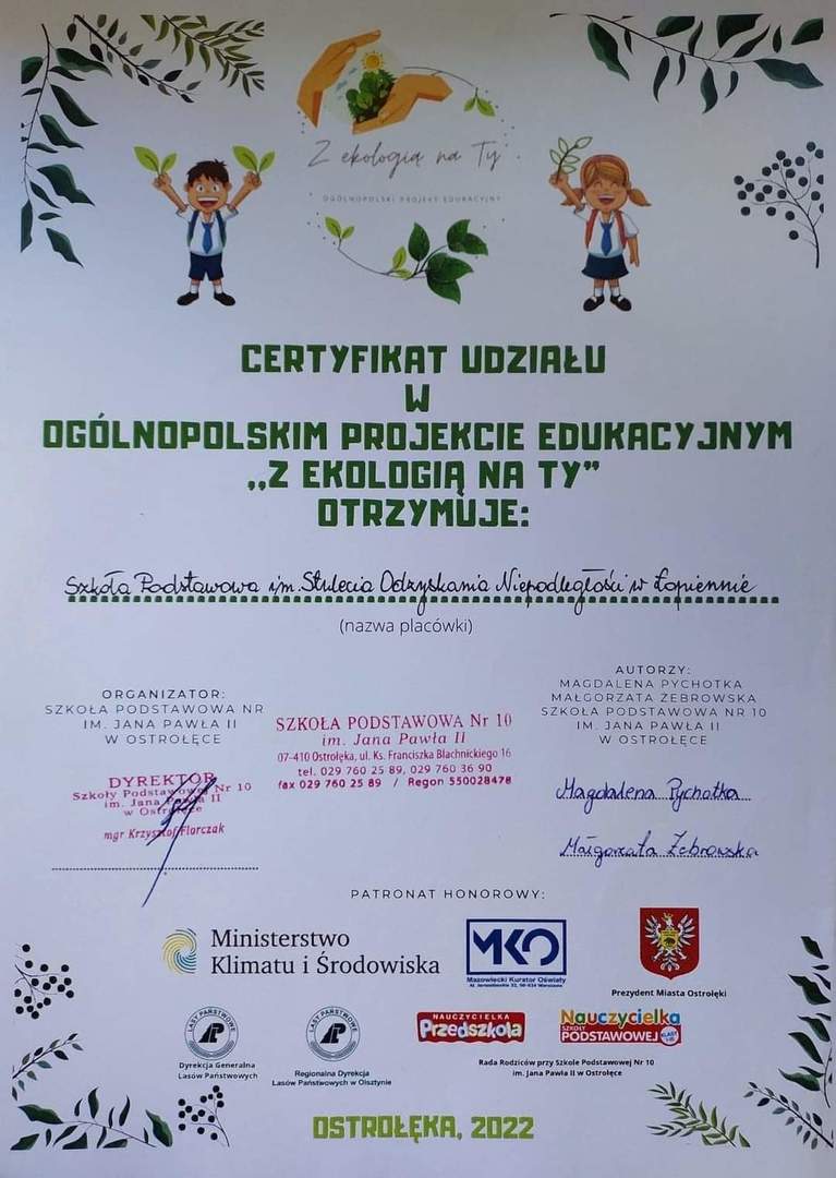 Z radością informujemy, że nasza szkoła uzyskała certyfikat potwierdzający aktywny udział uczniów i nauczycieli w Ogólnopolskim Projekcie Edukacyjnym "Z ekologią na ty".