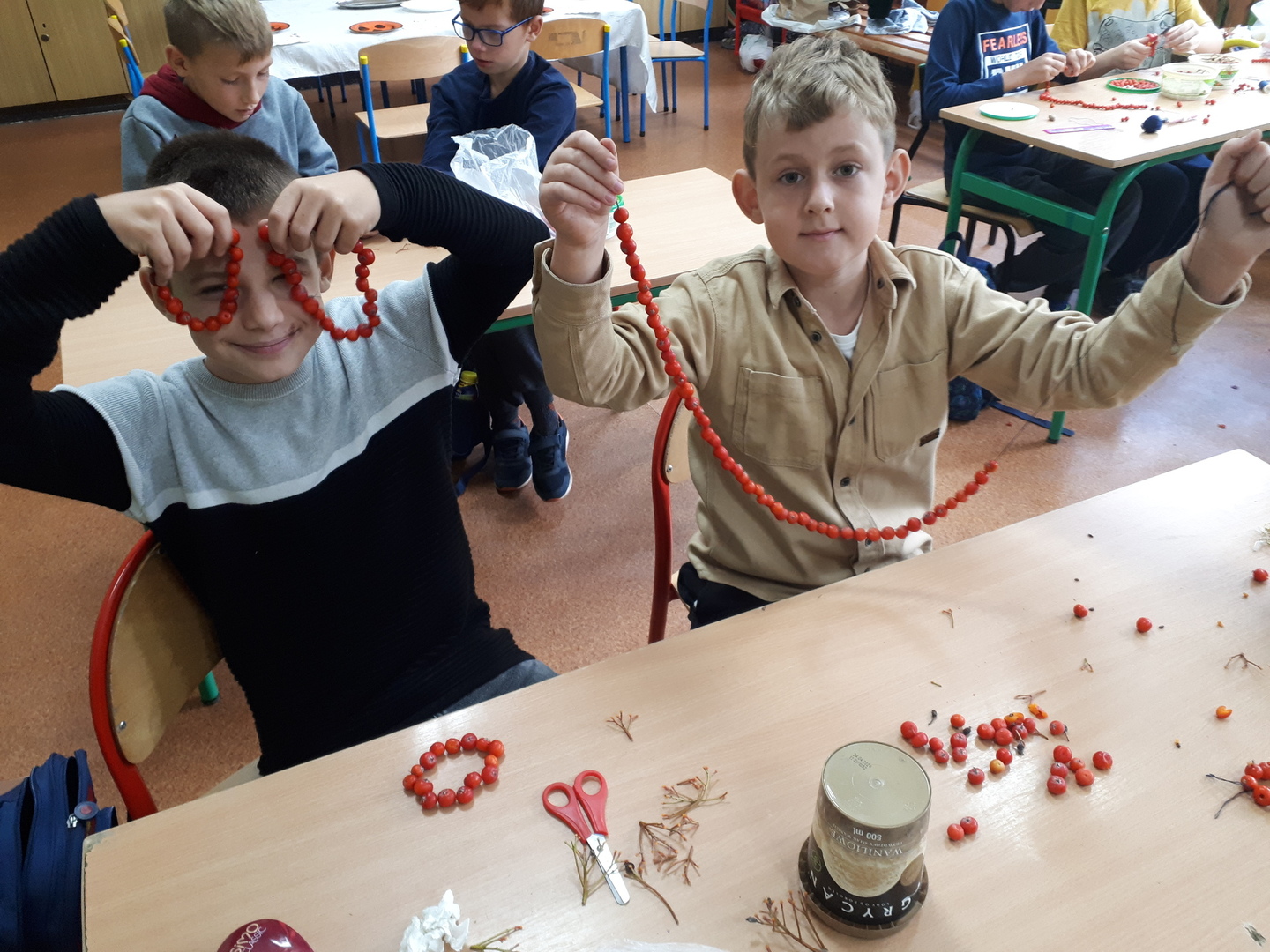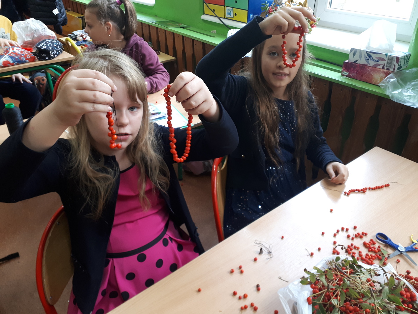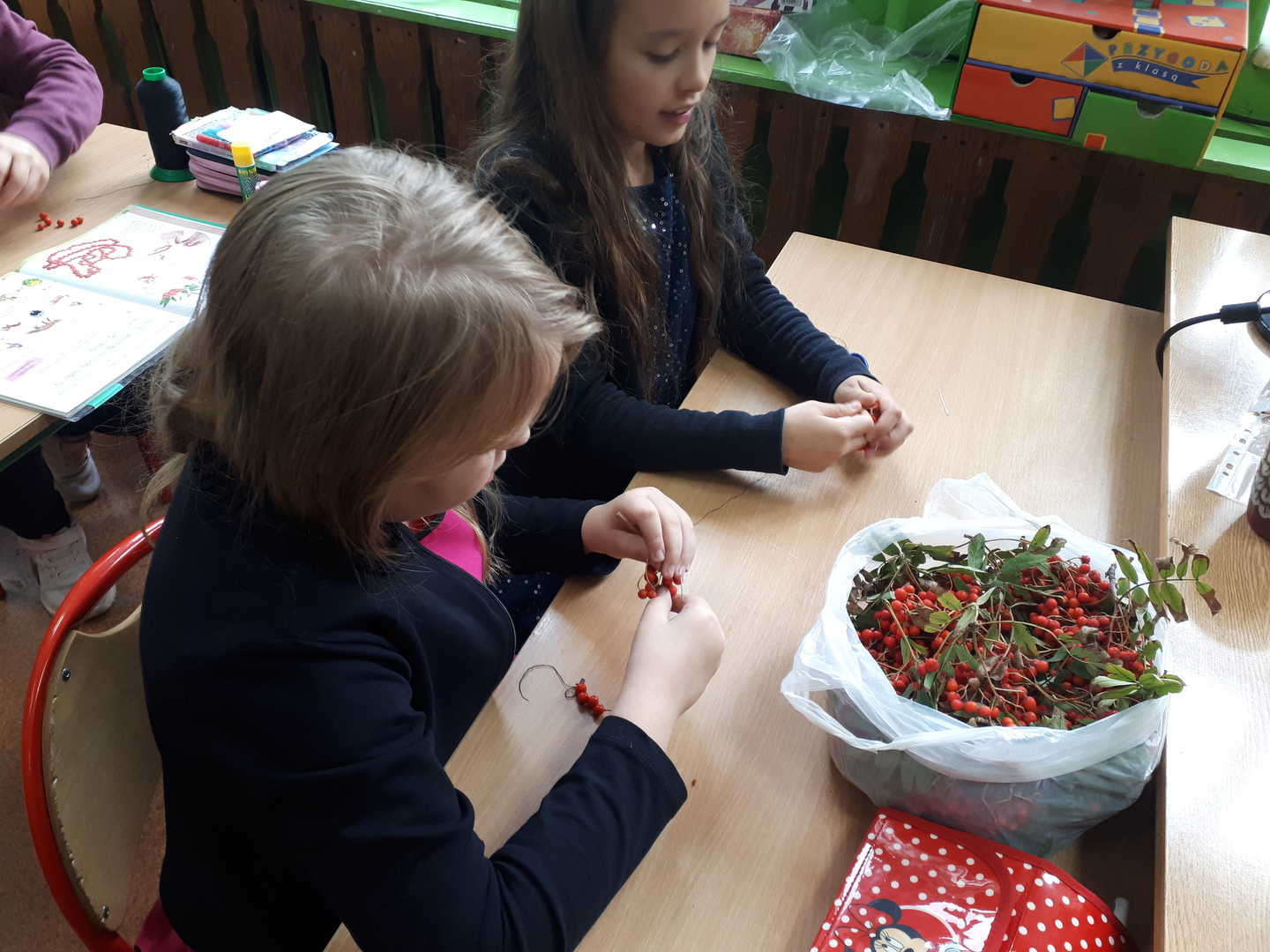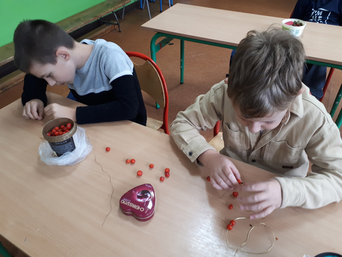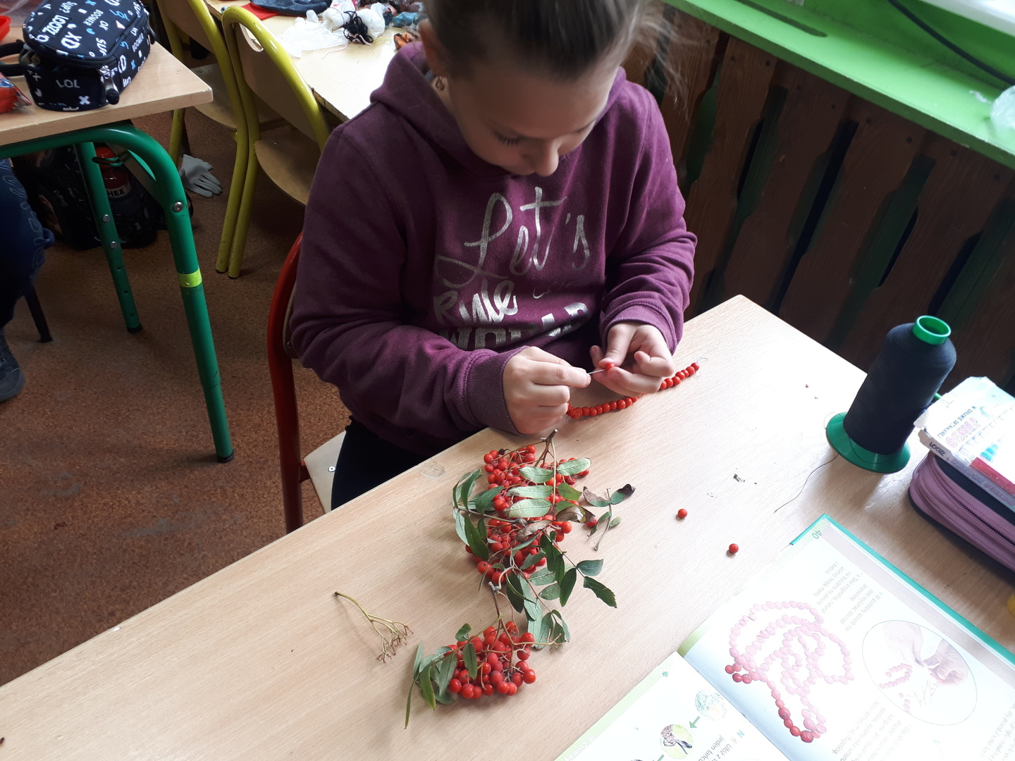 Gruba igła, nici, owoce jarzębiny, odrobina cierpliwości i już można obdarować mamę, babcię lub koleżankę oryginalną, naturalną biżuterią. Taką właśnie biżuterię uczyli się dziś robić uczniowie klasy 3 na lekcji techniki.