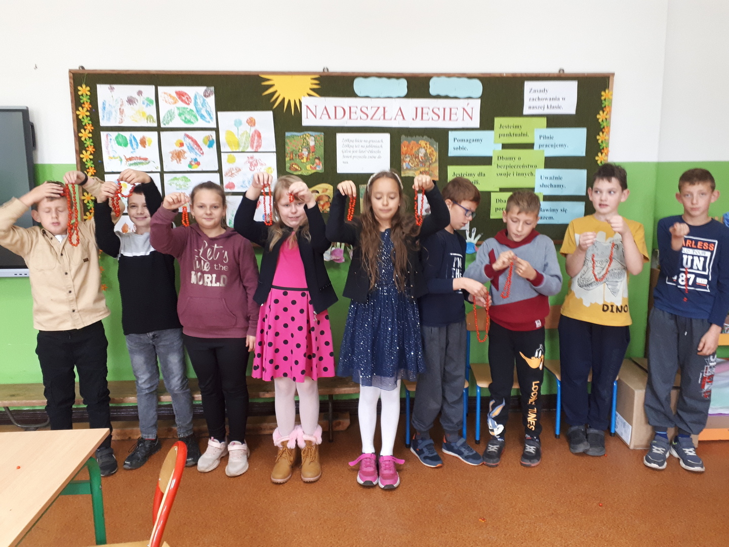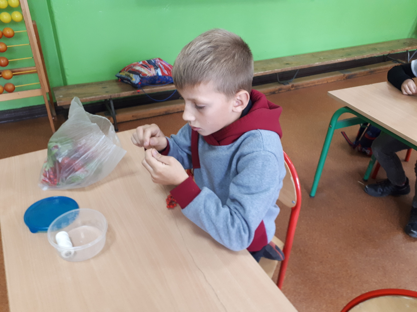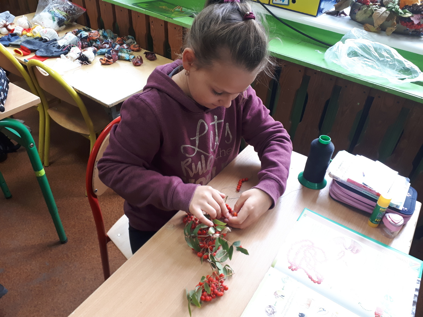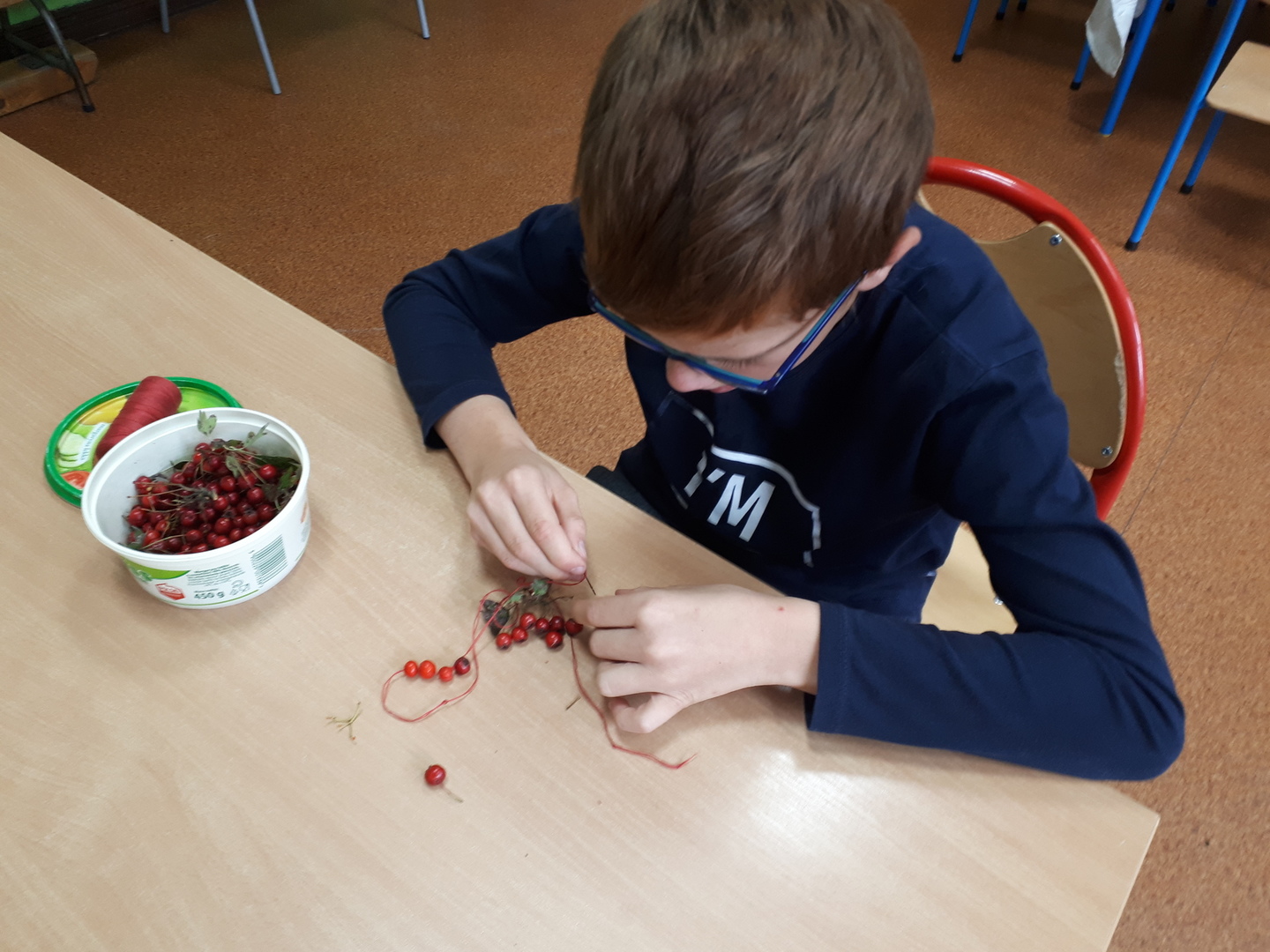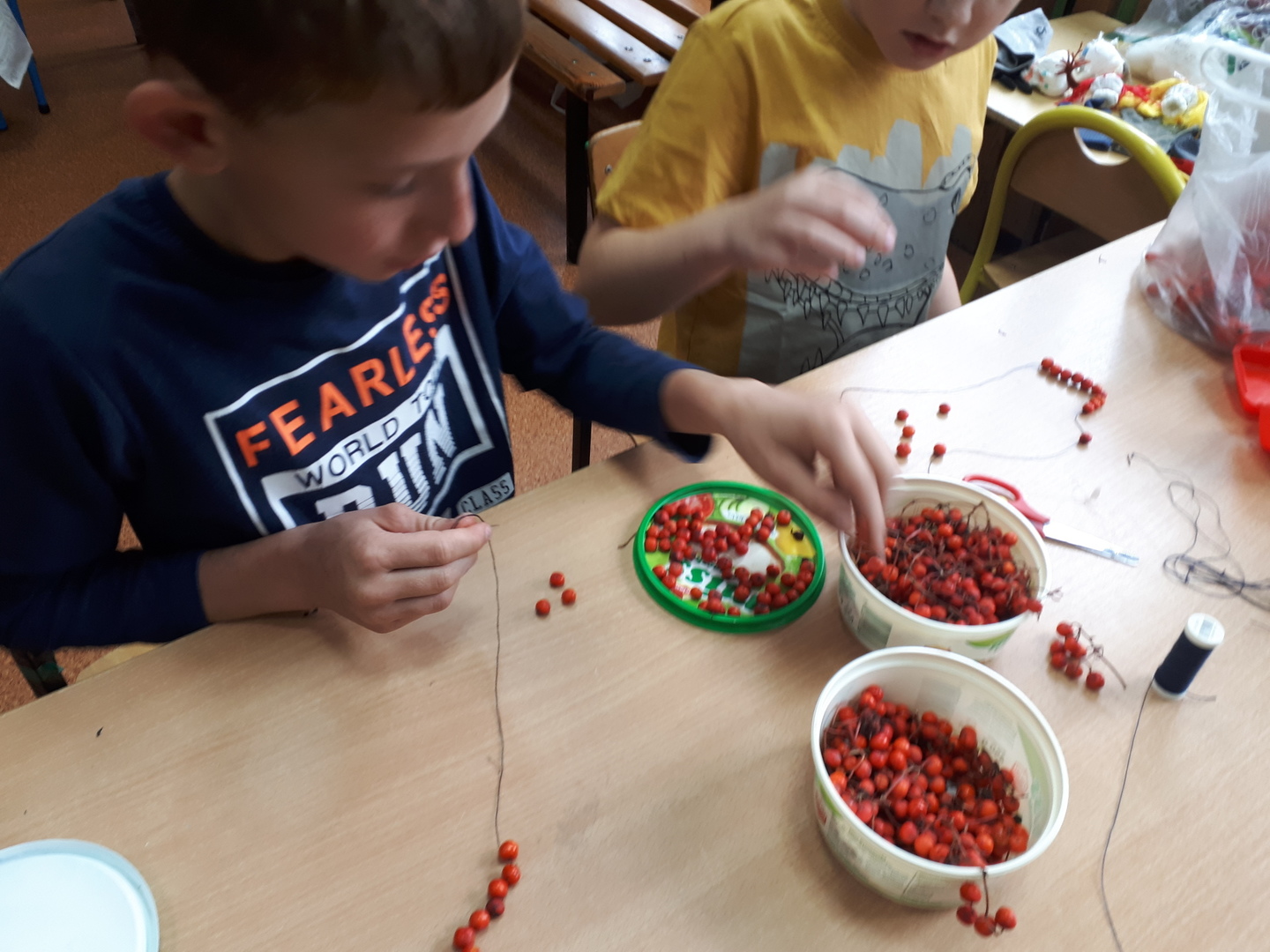 Gruba igła, nici, owoce jarzębiny, odrobina cierpliwości i już można obdarować mamę, babcię lub koleżankę oryginalną, naturalną biżuterią. Taką właśnie biżuterię uczyli się dziś robić uczniowie klasy 3 na lekcji techniki.