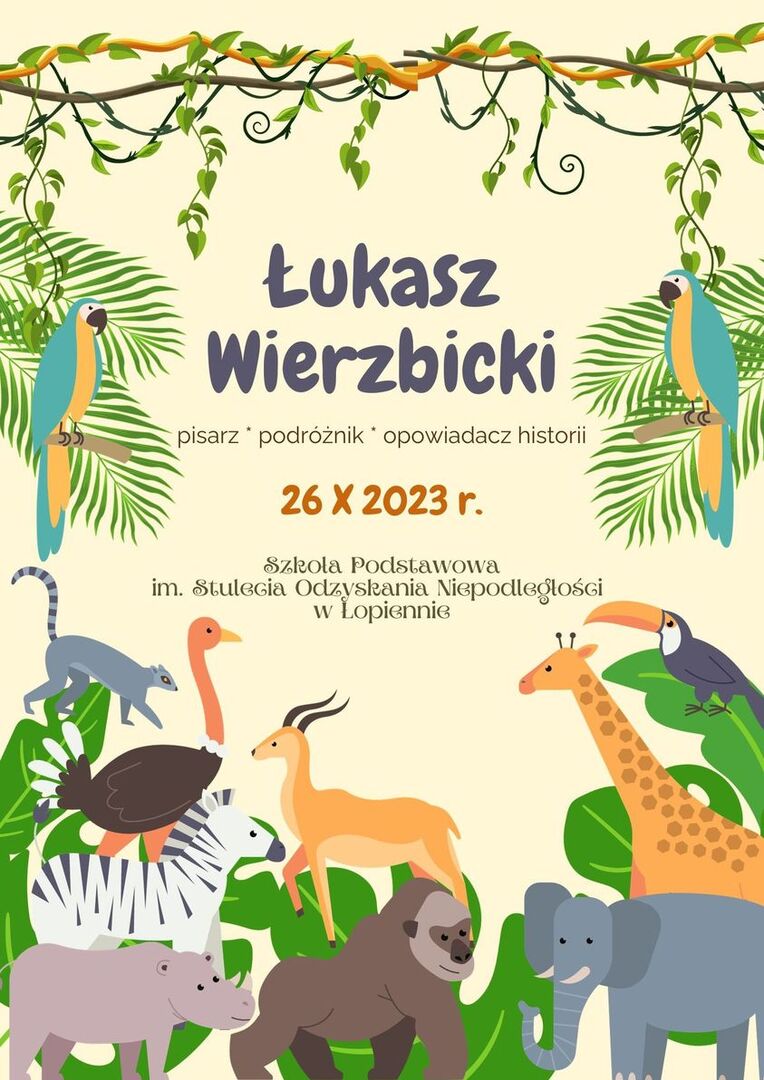 W czwartek, 26.10.2023r., do naszej szkoły zawita niezwykły gość, autor książek dla dzieci, podróżnik, opowiadacz historii - pan Łukasz Wierzbicki. Znamy go z takich książek, jak m.in. "Afryka Kazika", "Dziadek i Niedźwiadek", "Ocean to pikuś", "Machiną przez Chiny", "Wokół świata na wariata", "Co Hrabia porabia?". Nie możemy się doczekać tego wyjątkowego wydarzenia!