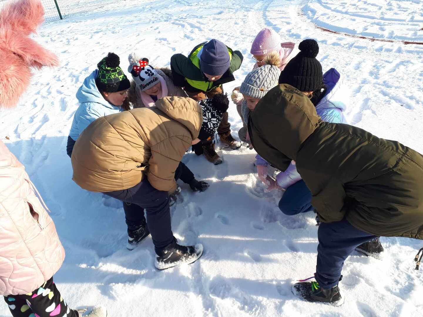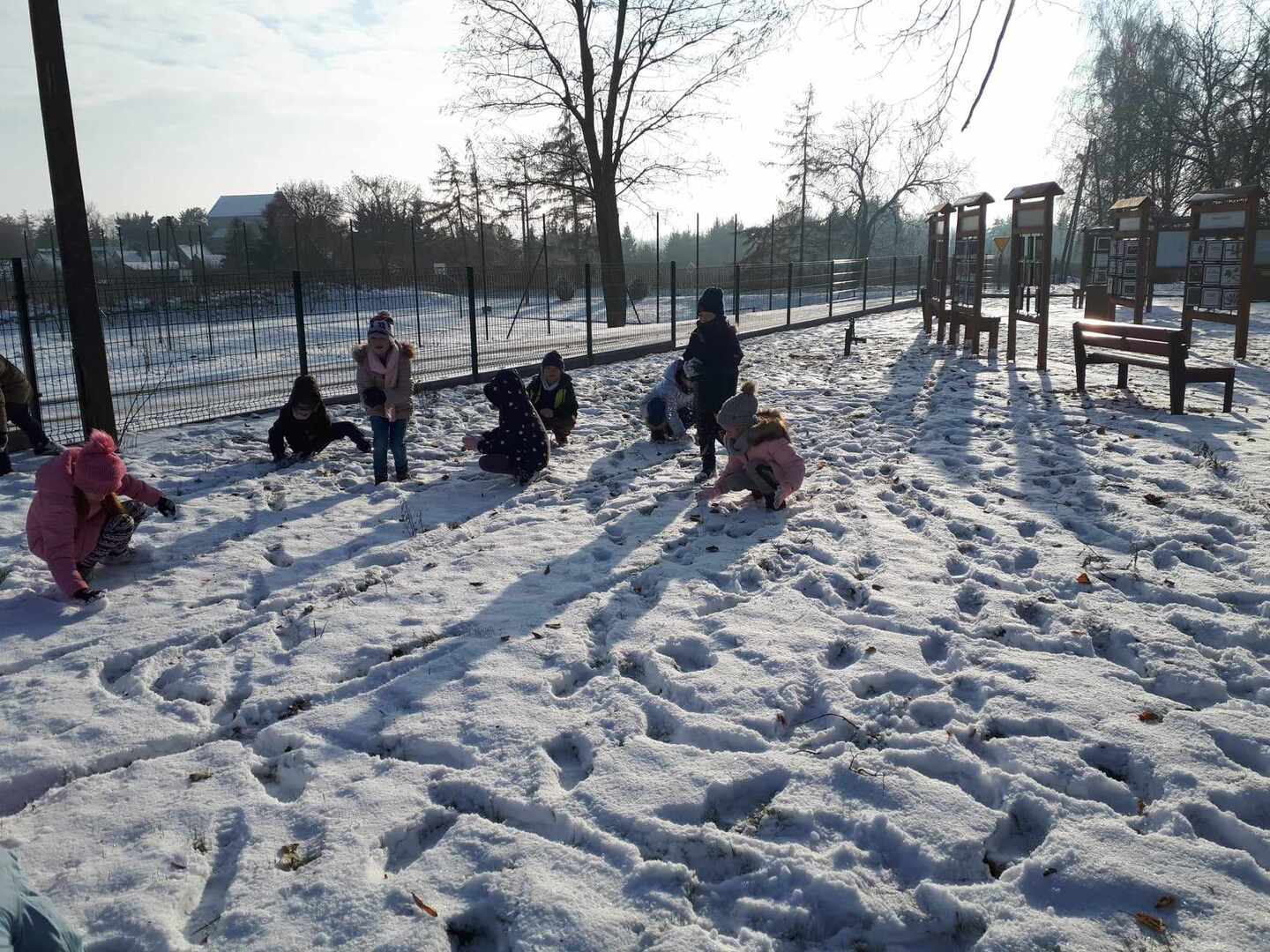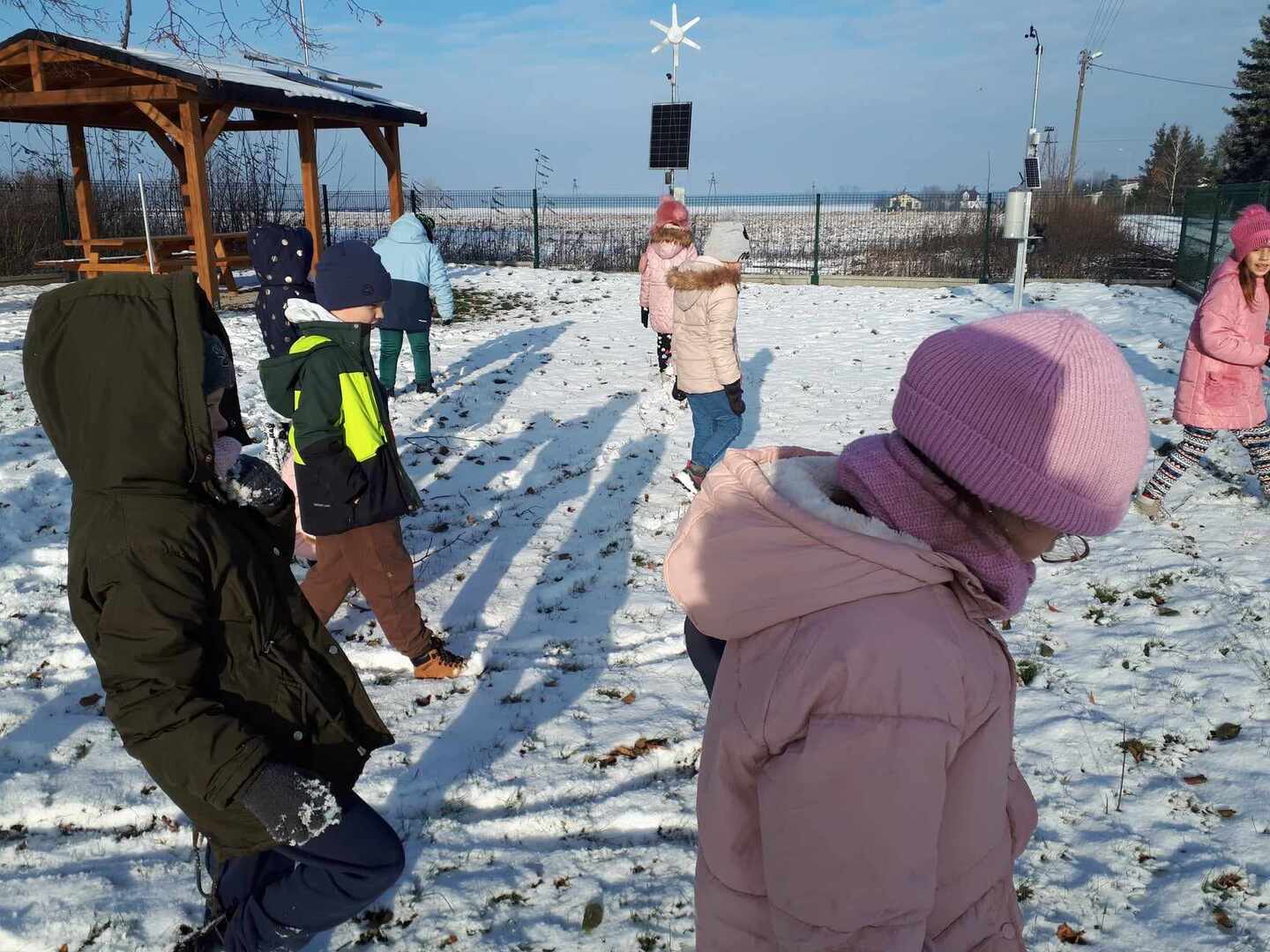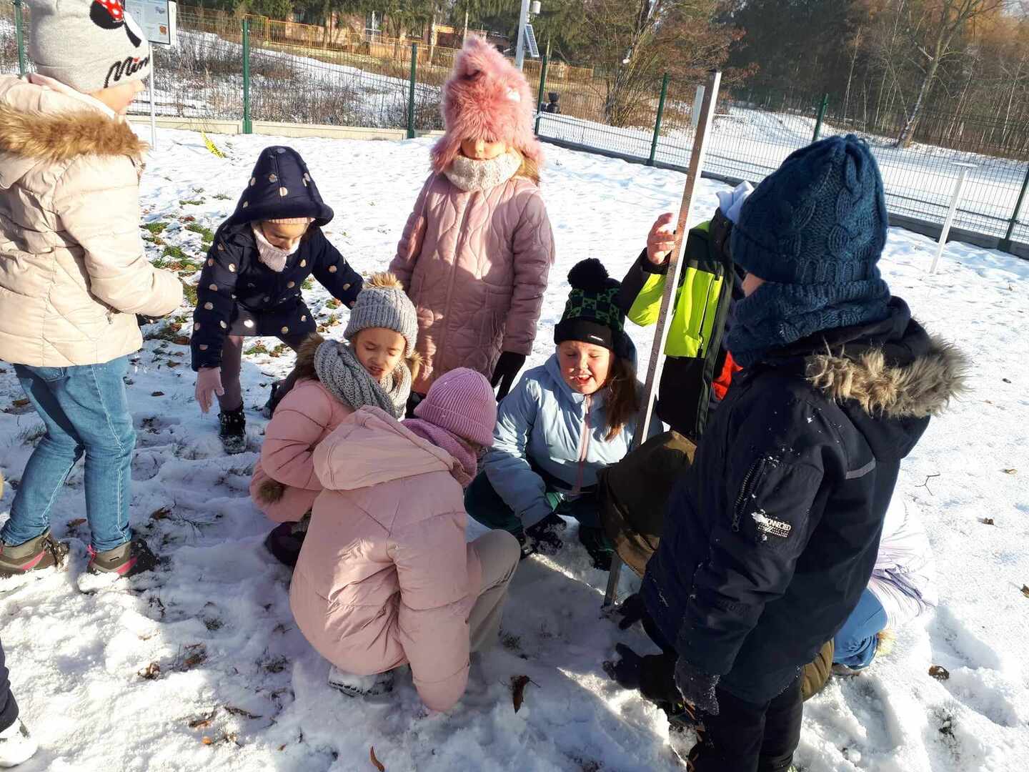 Pierwszy śnieg i słoneczny dzień zachęciły uczniów klas 1-3 do kolejnych obserwacji przyrodniczych na ścieżce edukacyjnej i w ogródku meteorologicznym znajdującym się przy naszej szkole. Podczas zajęć rozwijających umiejętności przyrodnicze najmłodsi uczniowie podziwiali piękno śnieżnej aury, obserwowali wskazania rękawa meteorologicznego, czyli siłę i kierunek wiatru, odczytywali temperaturę z termometrów gruntowych oraz wysokość pokrywy śnieżnej na powierzchni gruntu, wykorzystując służącą do tego tyczkę śniegową, wzbogacali wiedzę na temat tropów zwierząt oraz życia zwierząt leśnych późną jesienią i porą zimową.