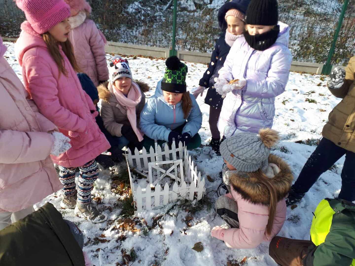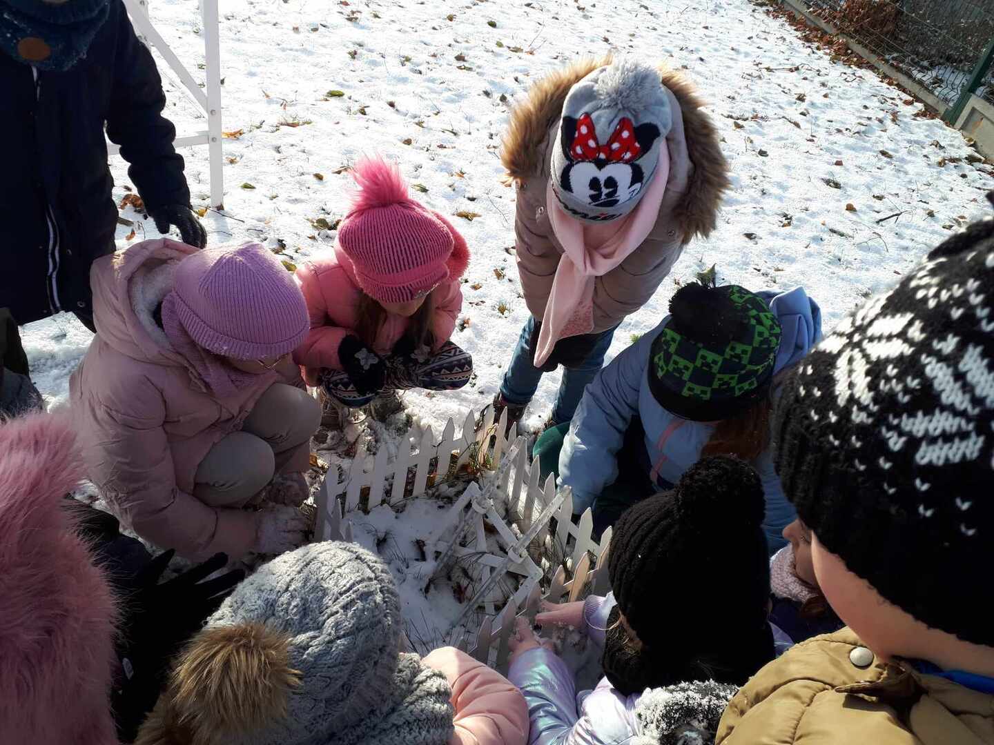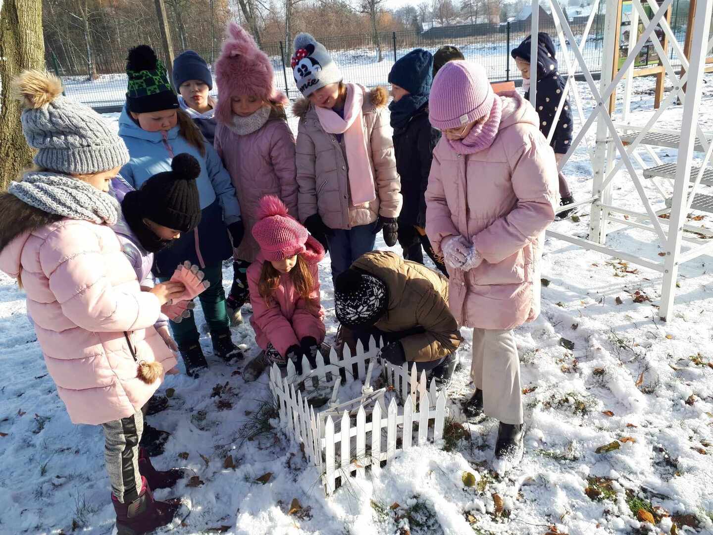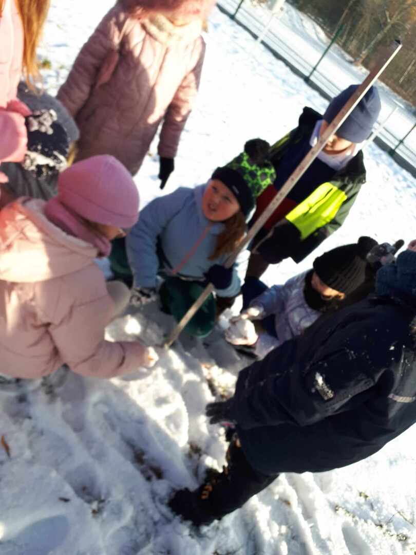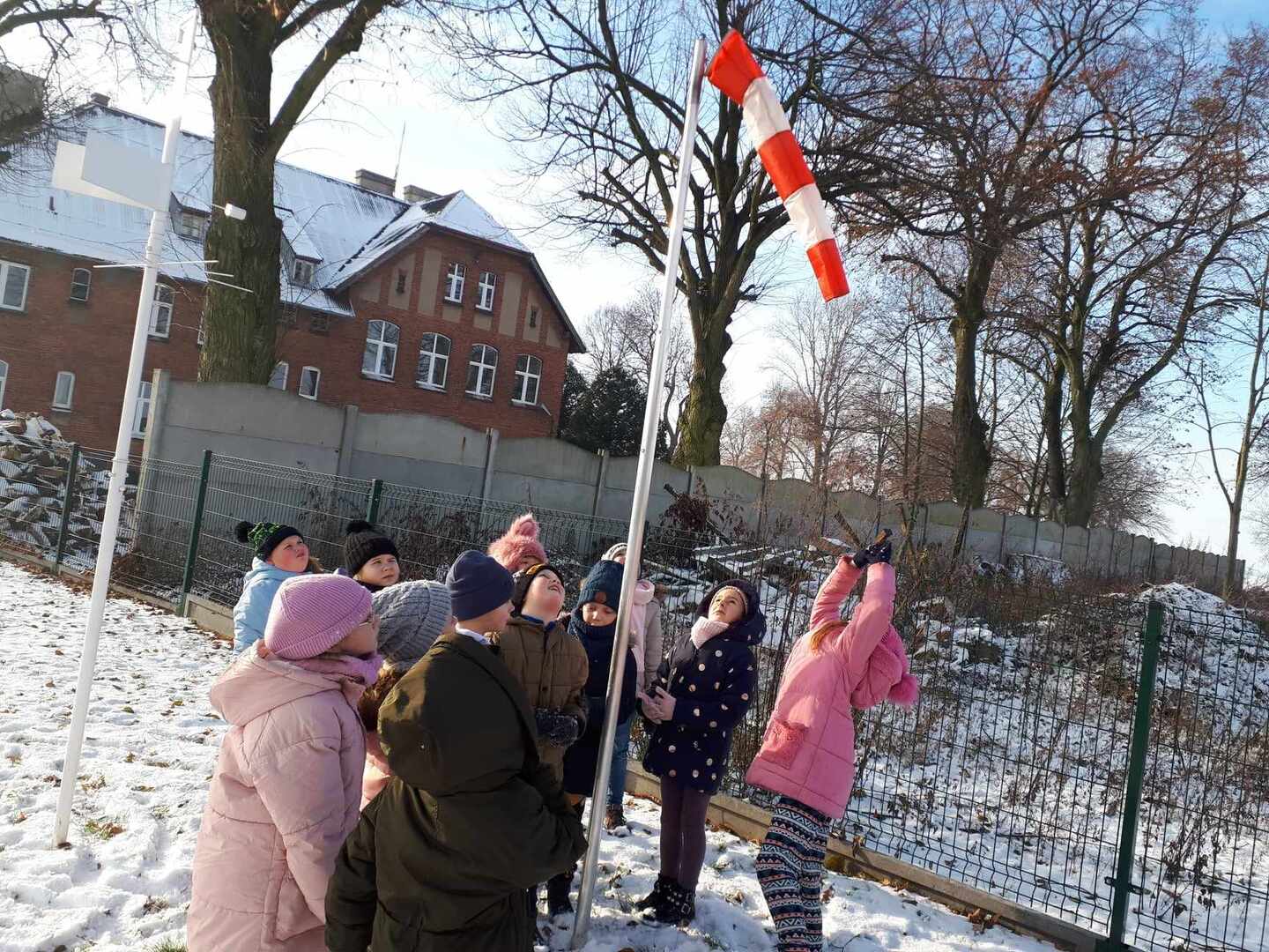 Pierwszy śnieg i słoneczny dzień zachęciły uczniów klas 1-3 do kolejnych obserwacji przyrodniczych na ścieżce edukacyjnej i w ogródku meteorologicznym znajdującym się przy naszej szkole. Podczas zajęć rozwijających umiejętności przyrodnicze najmłodsi uczniowie podziwiali piękno śnieżnej aury, obserwowali wskazania rękawa meteorologicznego, czyli siłę i kierunek wiatru, odczytywali temperaturę z termometrów gruntowych oraz wysokość pokrywy śnieżnej na powierzchni gruntu, wykorzystując służącą do tego tyczkę śniegową, wzbogacali wiedzę na temat tropów zwierząt oraz życia zwierząt leśnych późną jesienią i porą zimową.