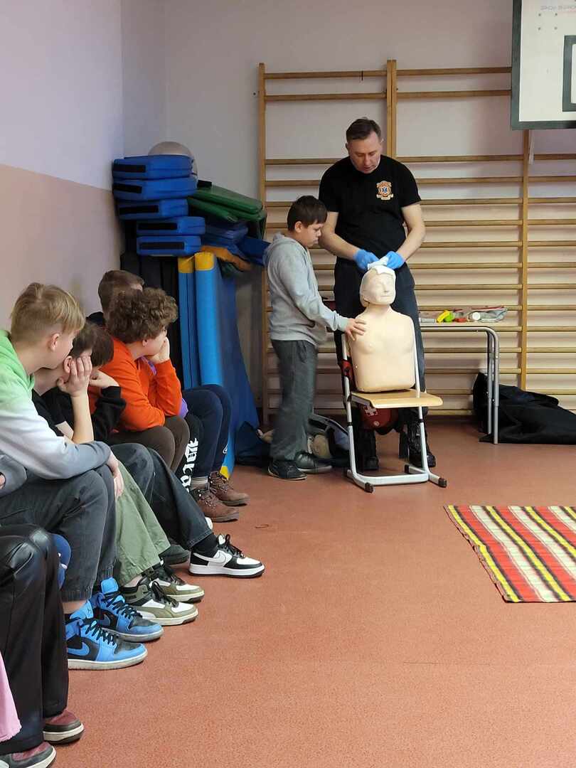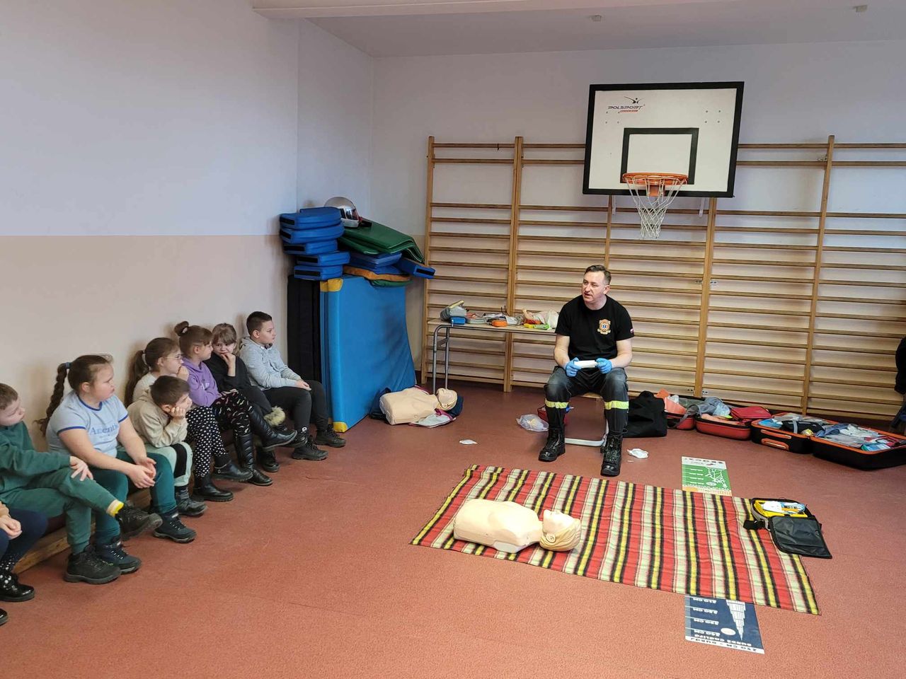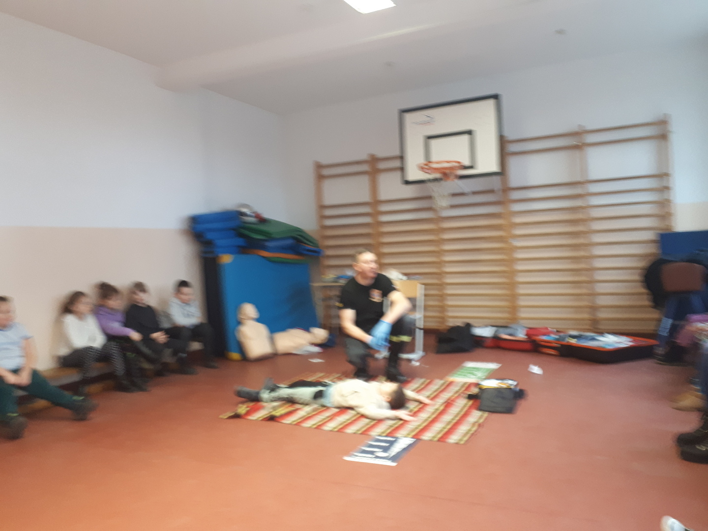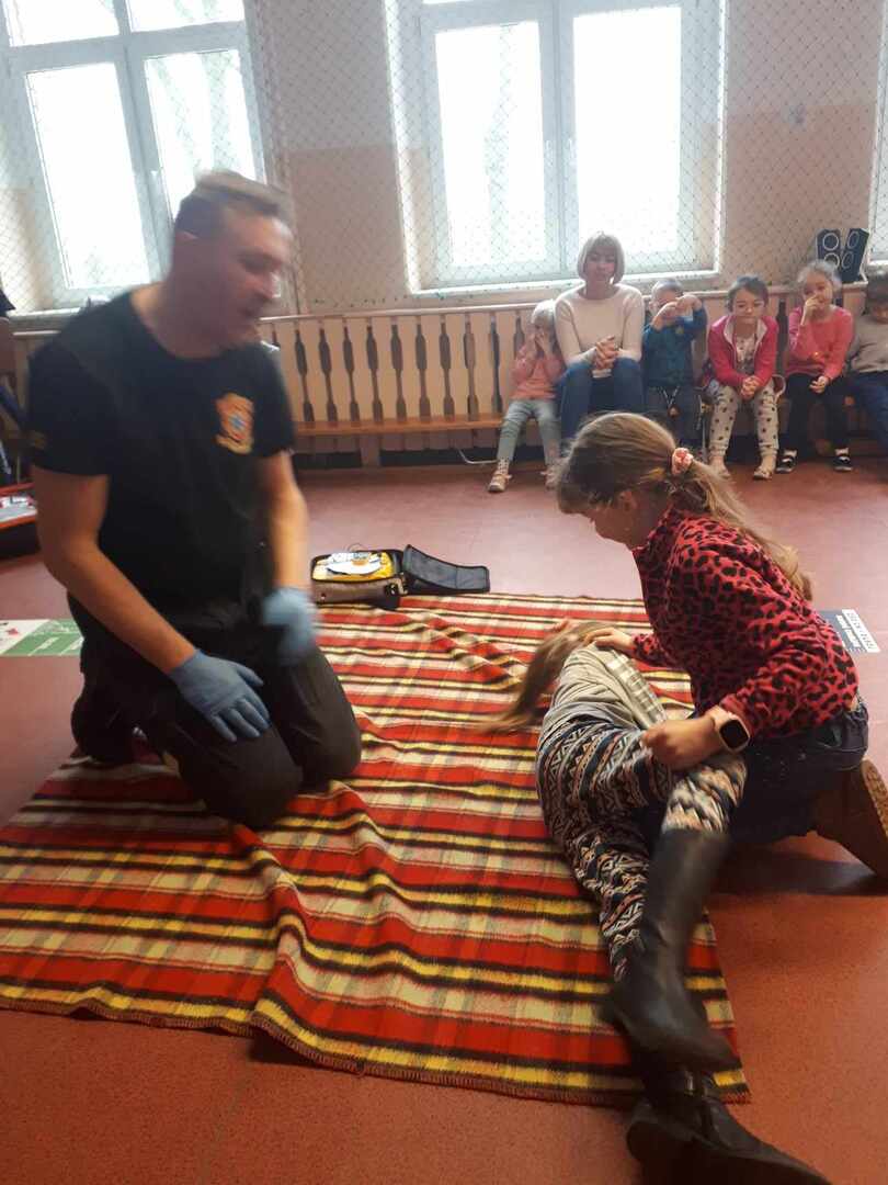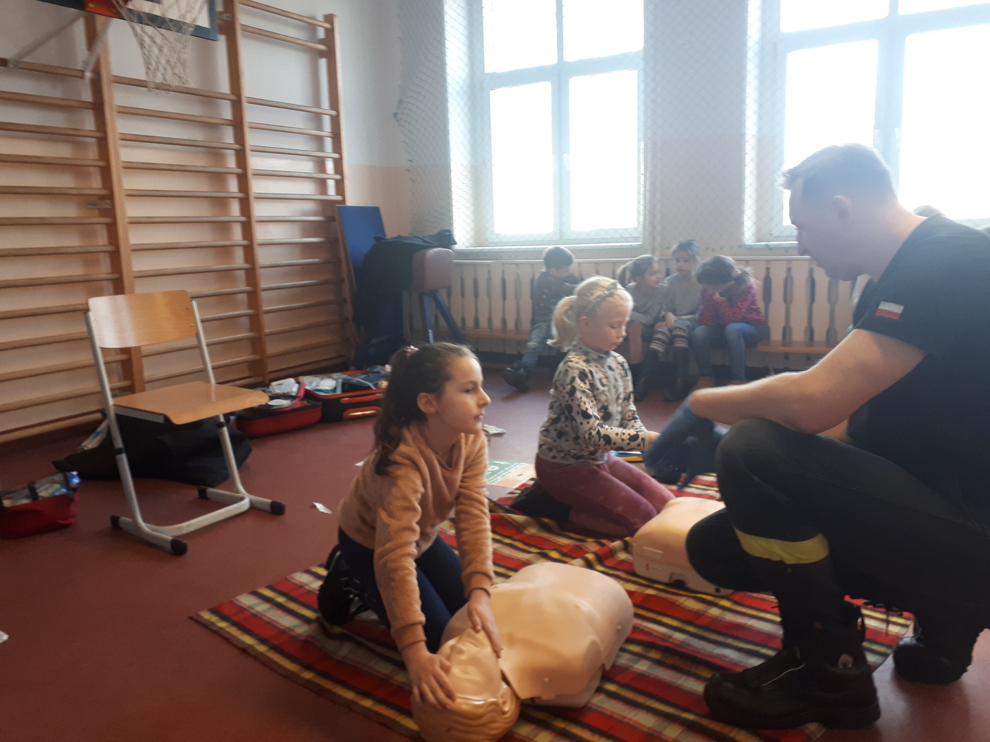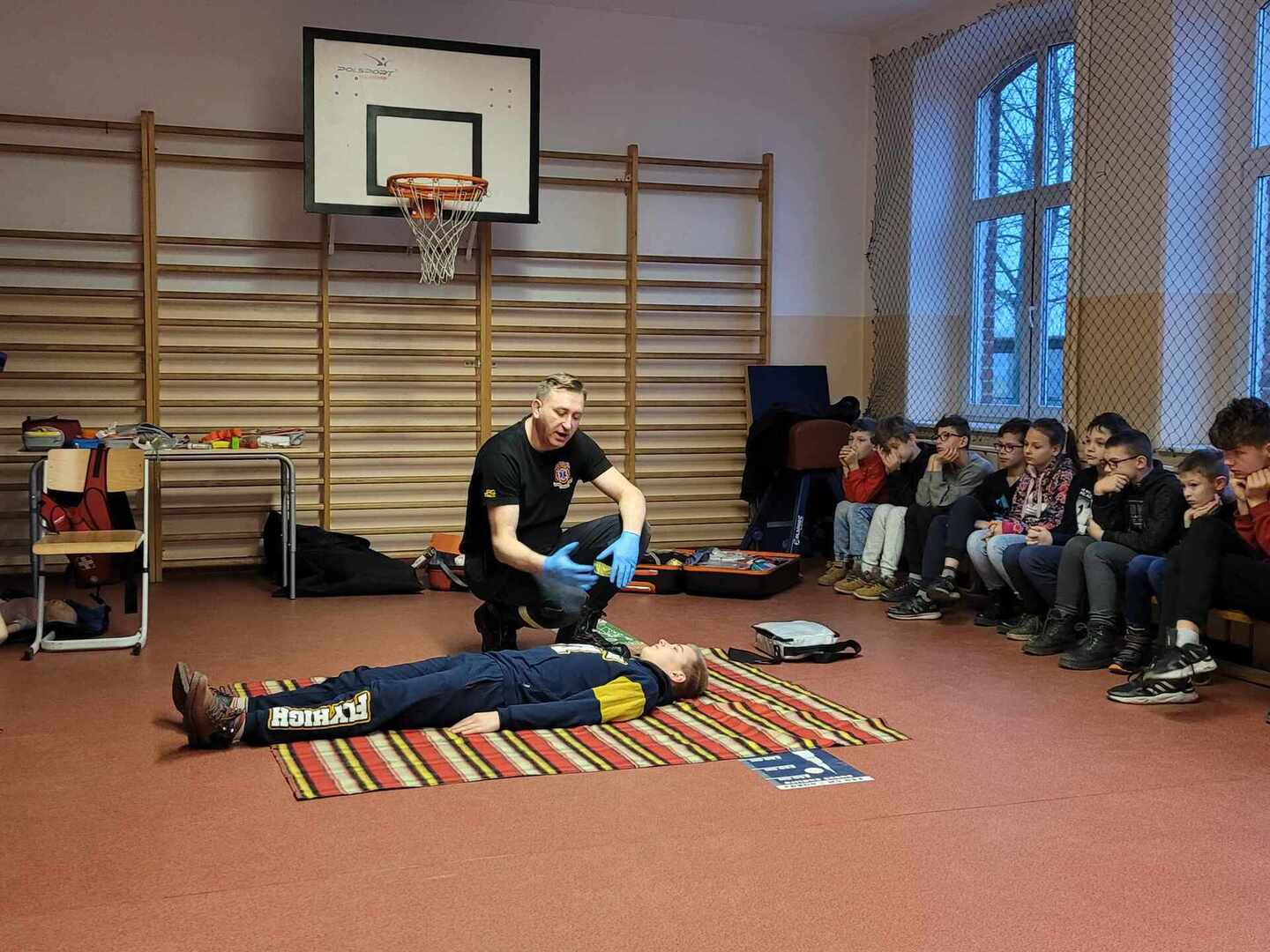 Podczas warsztatów przeprowadzonych z uczniami przez strażaka - ratownika medycznego - dzieci dowiedziały się, jak udzielać pierwszej pomocy przedmedycznej oraz w jaki sposób spędzać ferie zimowe, aby były one dla wszystkich bezpieczne