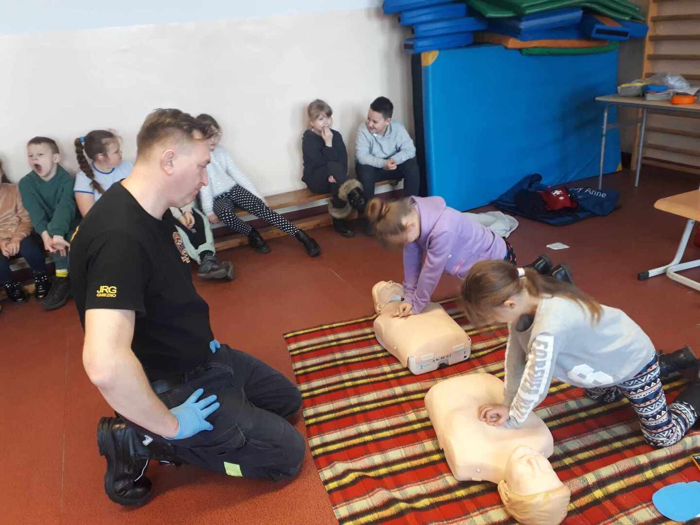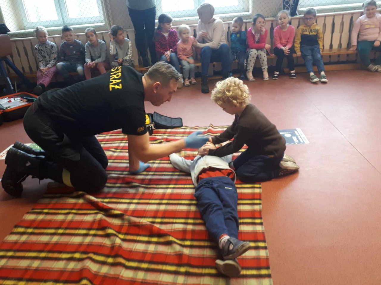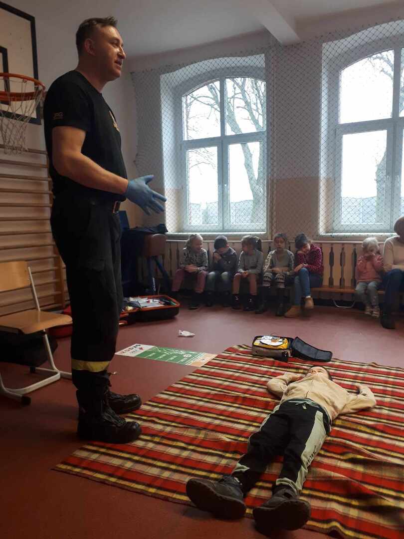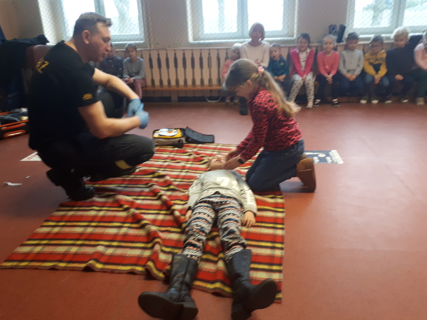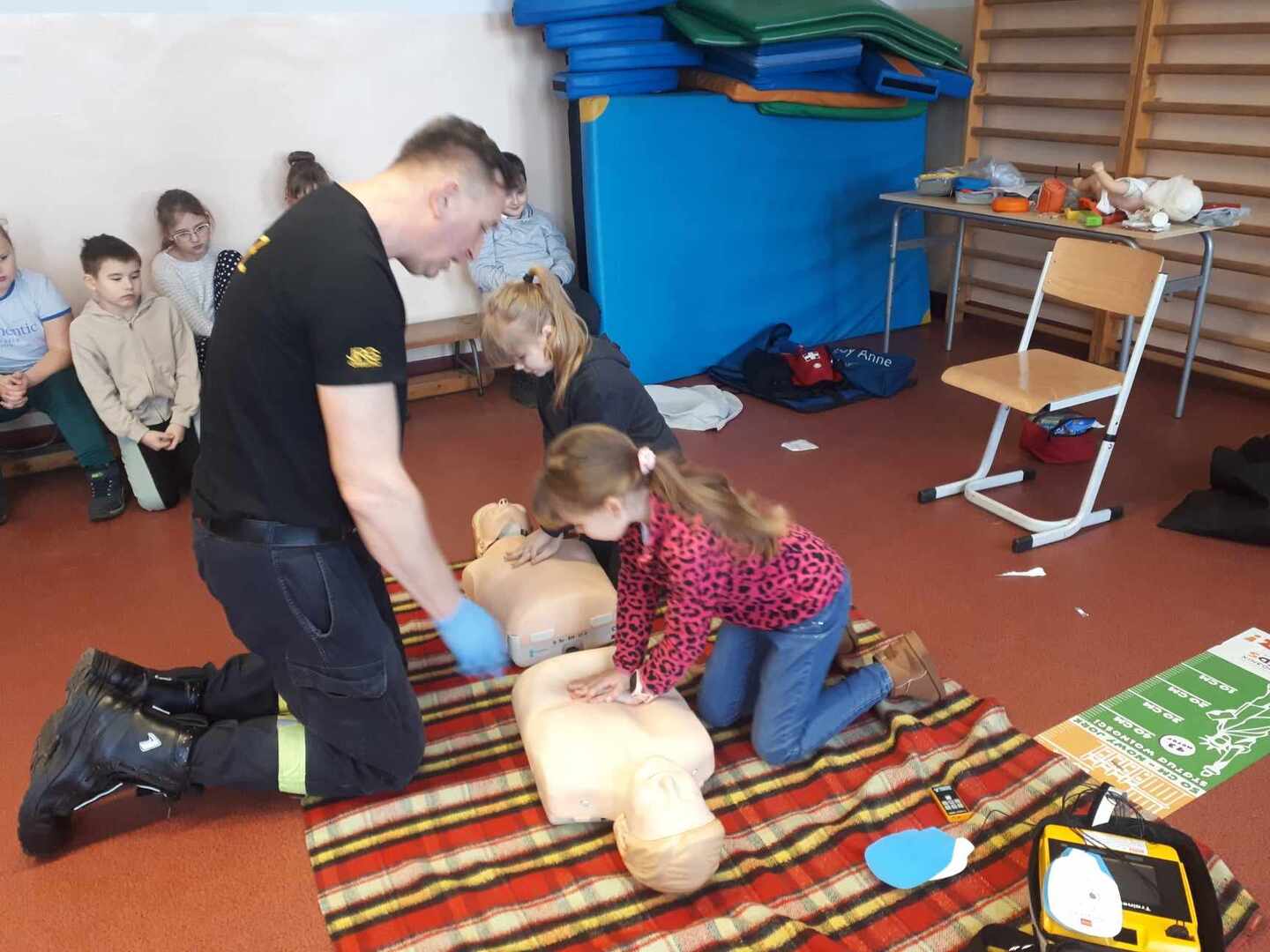 Podczas warsztatów przeprowadzonych z uczniami przez strażaka - ratownika medycznego - dzieci dowiedziały się, jak udzielać pierwszej pomocy przedmedycznej oraz w jaki sposób spędzać ferie zimowe, aby były one dla wszystkich bezpieczne