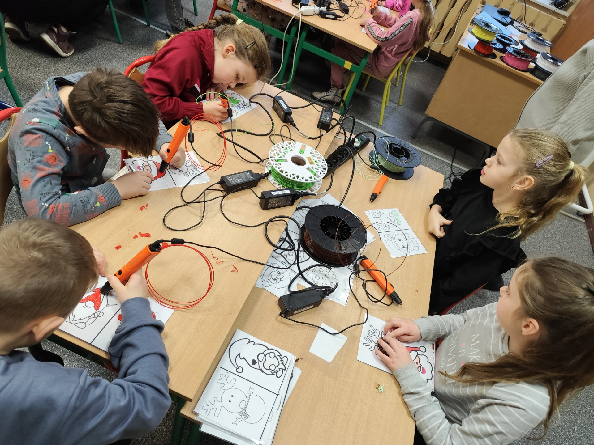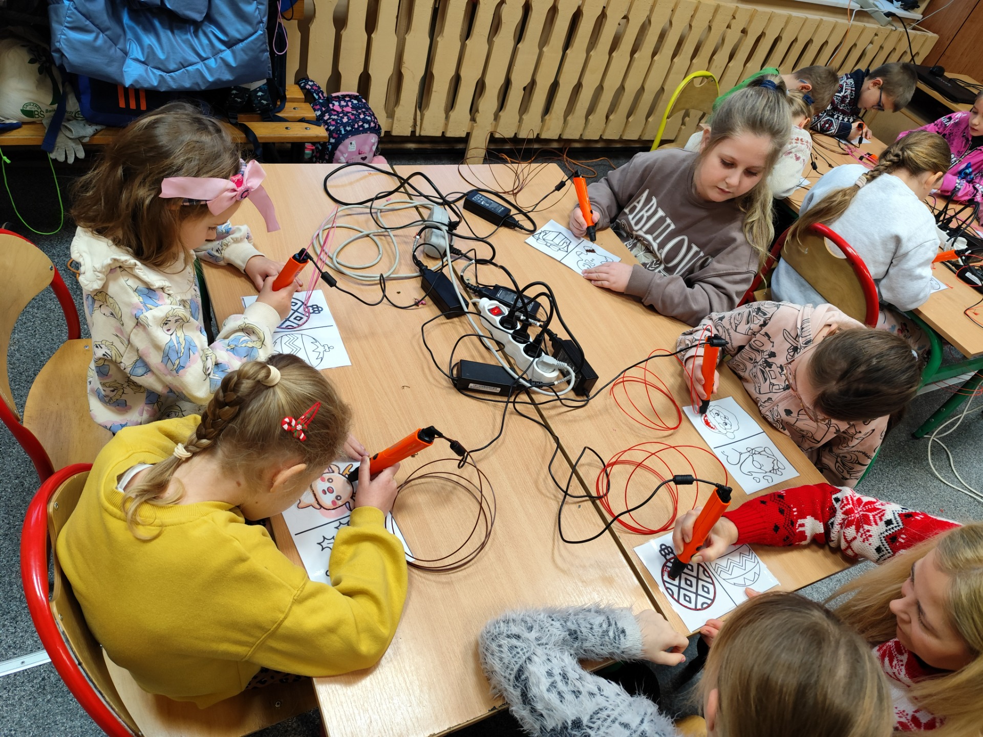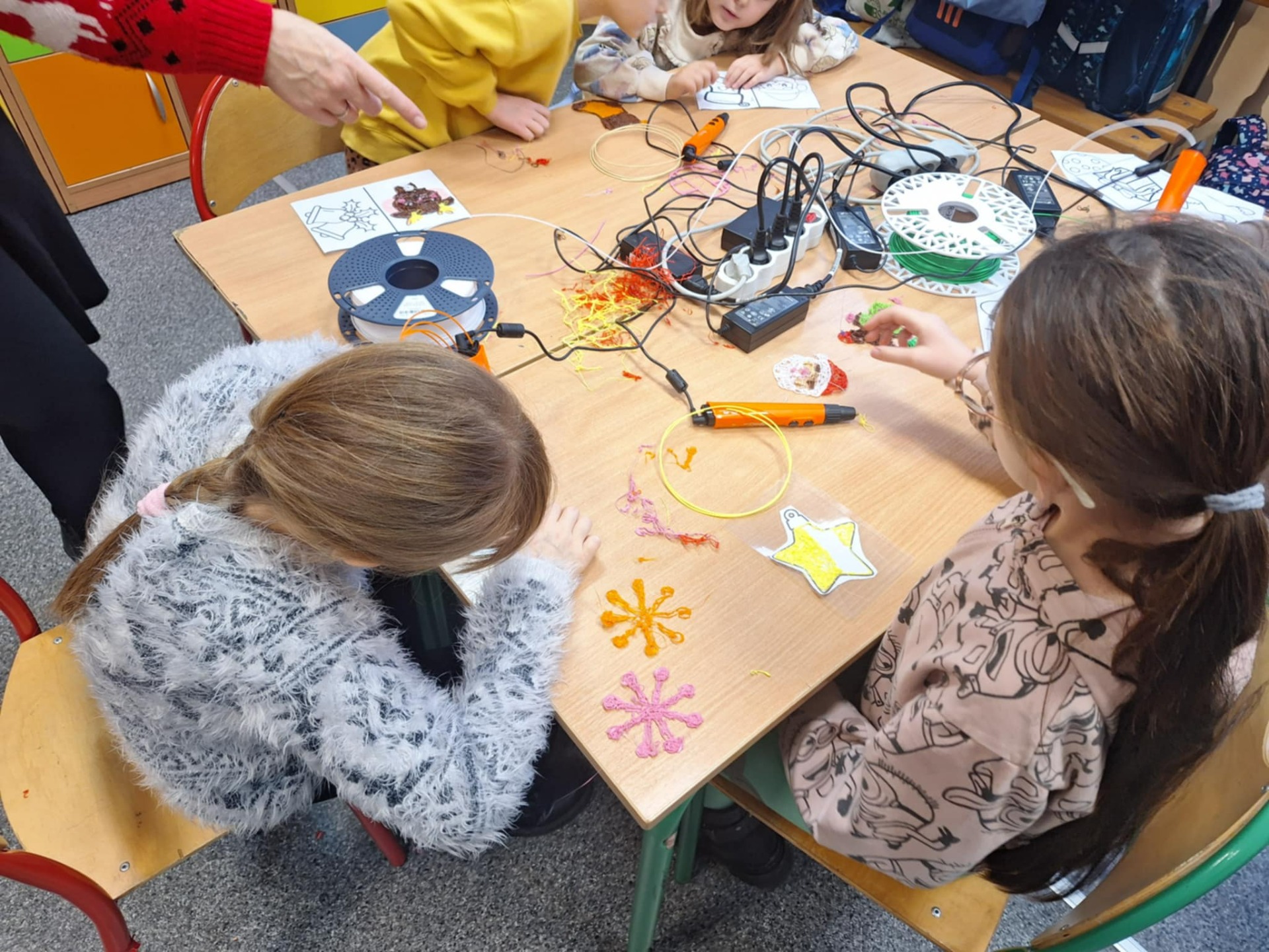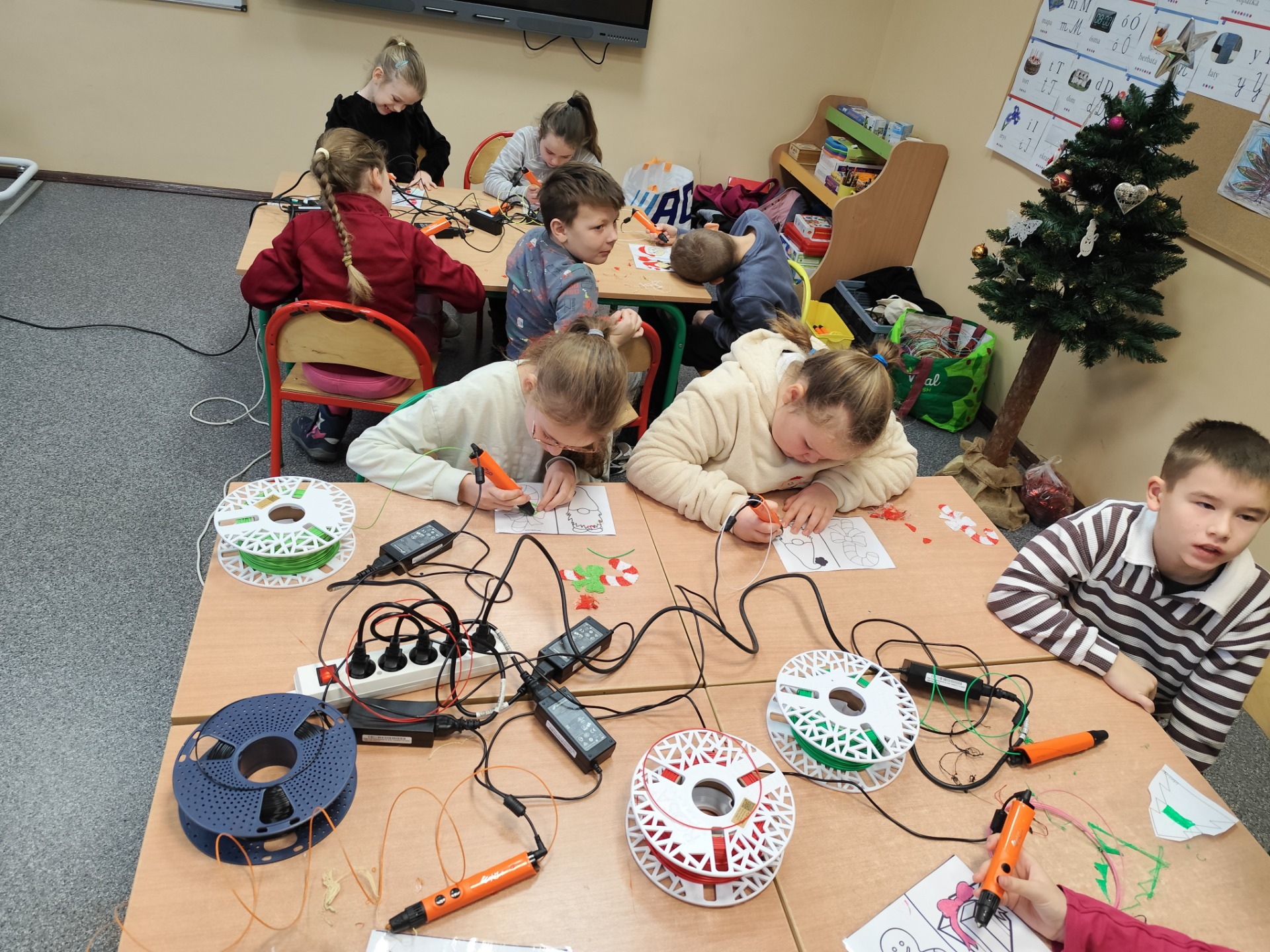 12 grudnia uczniowie klas 1- 4 na zaproszenie Gminnej Biblioteki Publicznej w Mieleszynie wzięli udział w warsztatach rysowania długopisami 3D, które były przeprowadzane przez ZiP Zabawa i Programowanie. Dzieci tworzyły wzory o tematyce świątecznej. Podczas warsztatów rozwijały swoją kreatywność i wyobraźnię. Uczyły się także staranności i cierpliwości. Udane wytwory m.in.: renifery, bombki, choinki, skrzaty były źródłem radości z pomyślnie wykonanych zadań.