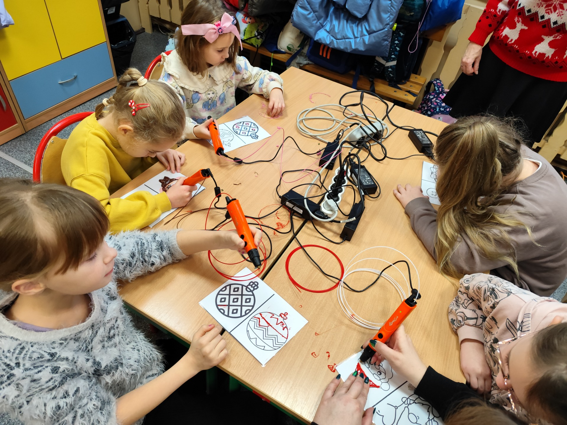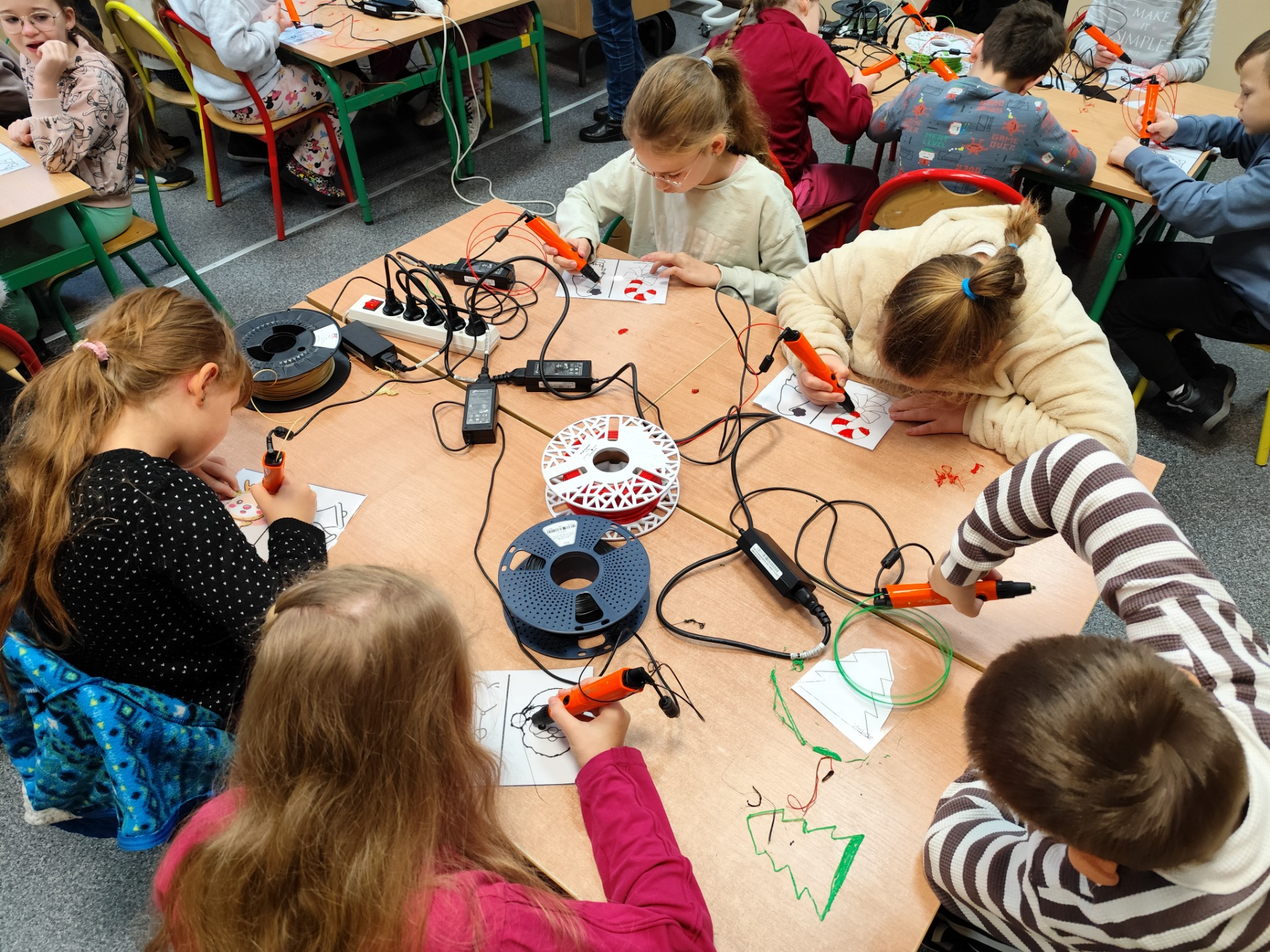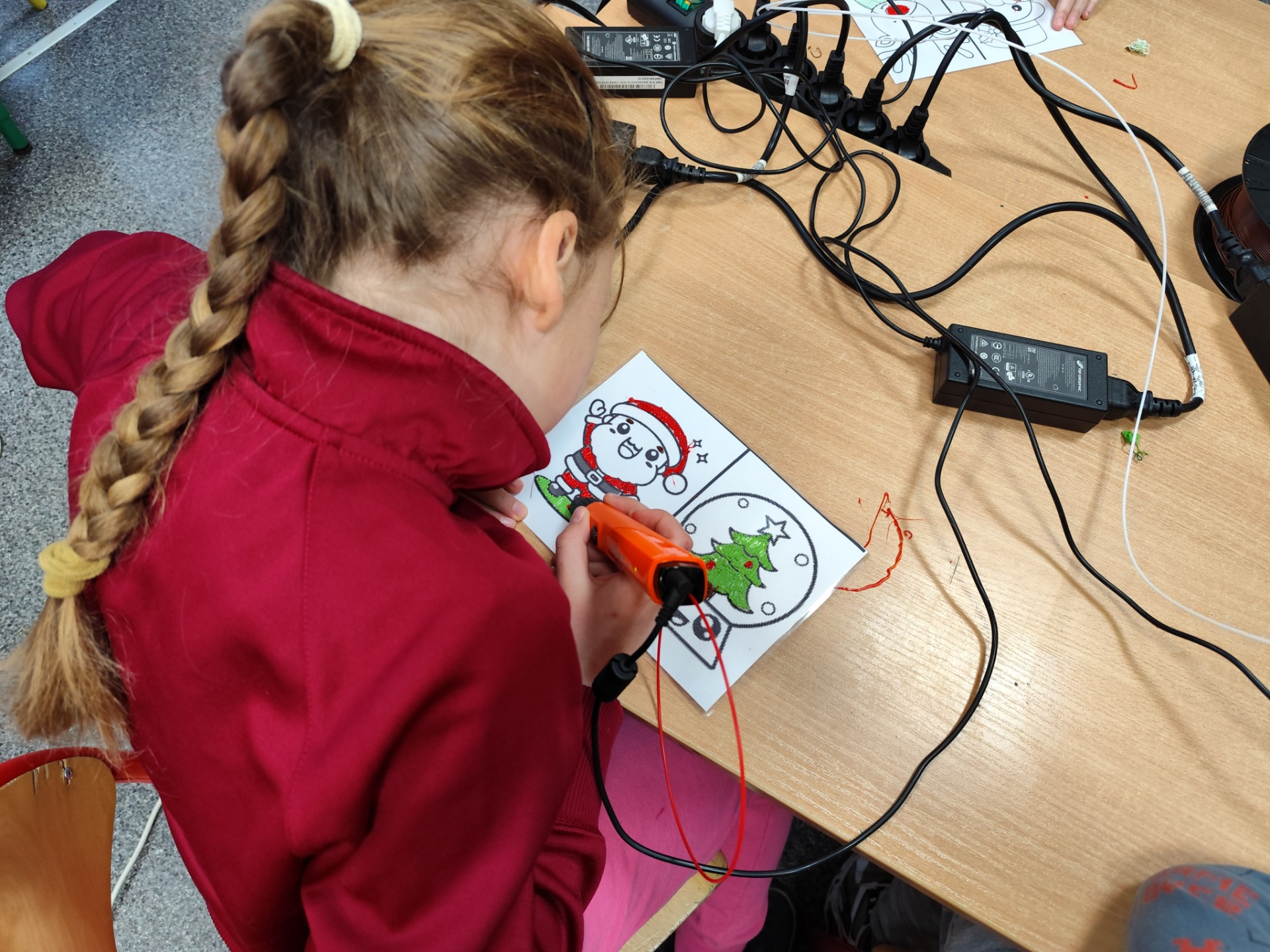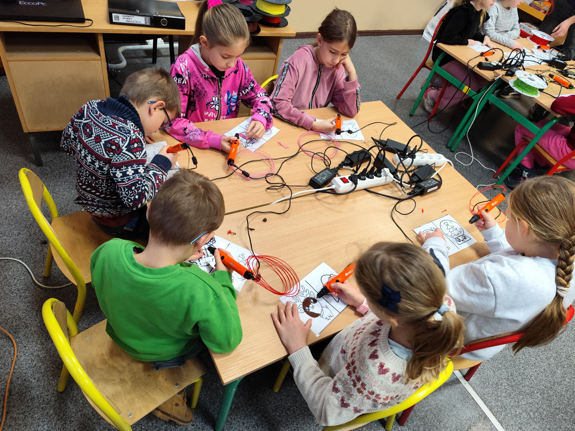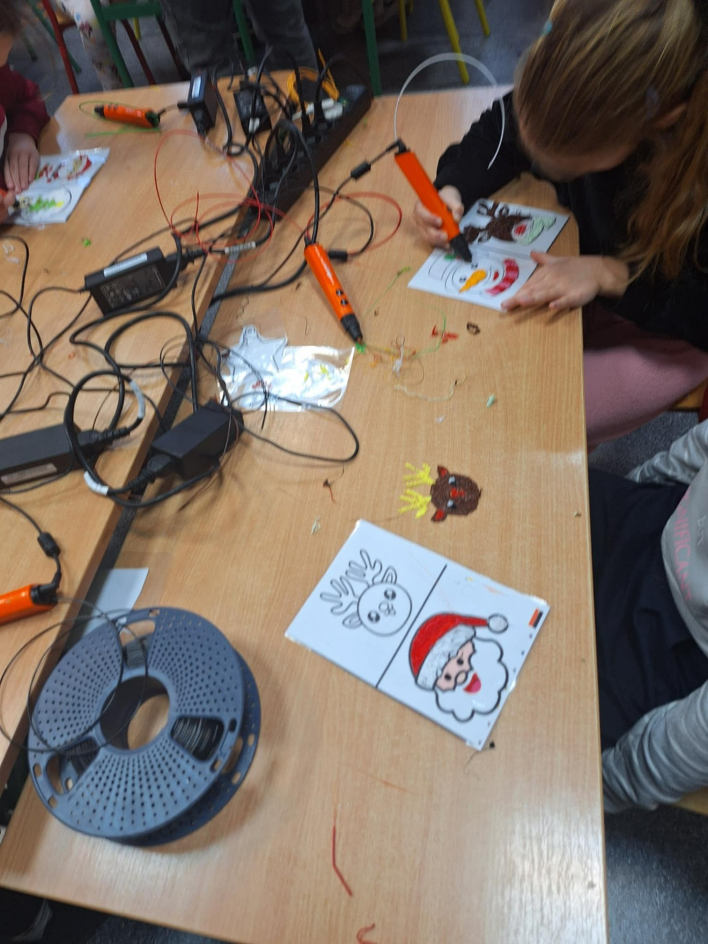 12 grudnia uczniowie klas 1- 4 na zaproszenie Gminnej Biblioteki Publicznej w Mieleszynie wzięli udział w warsztatach rysowania długopisami 3D, które były przeprowadzane przez ZiP Zabawa i Programowanie. Dzieci tworzyły wzory o tematyce świątecznej. Podczas warsztatów rozwijały swoją kreatywność i wyobraźnię. Uczyły się także staranności i cierpliwości. Udane wytwory m.in.: renifery, bombki, choinki, skrzaty były źródłem radości z pomyślnie wykonanych zadań.