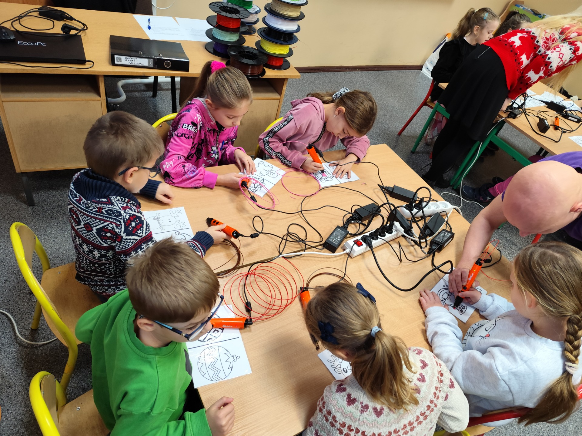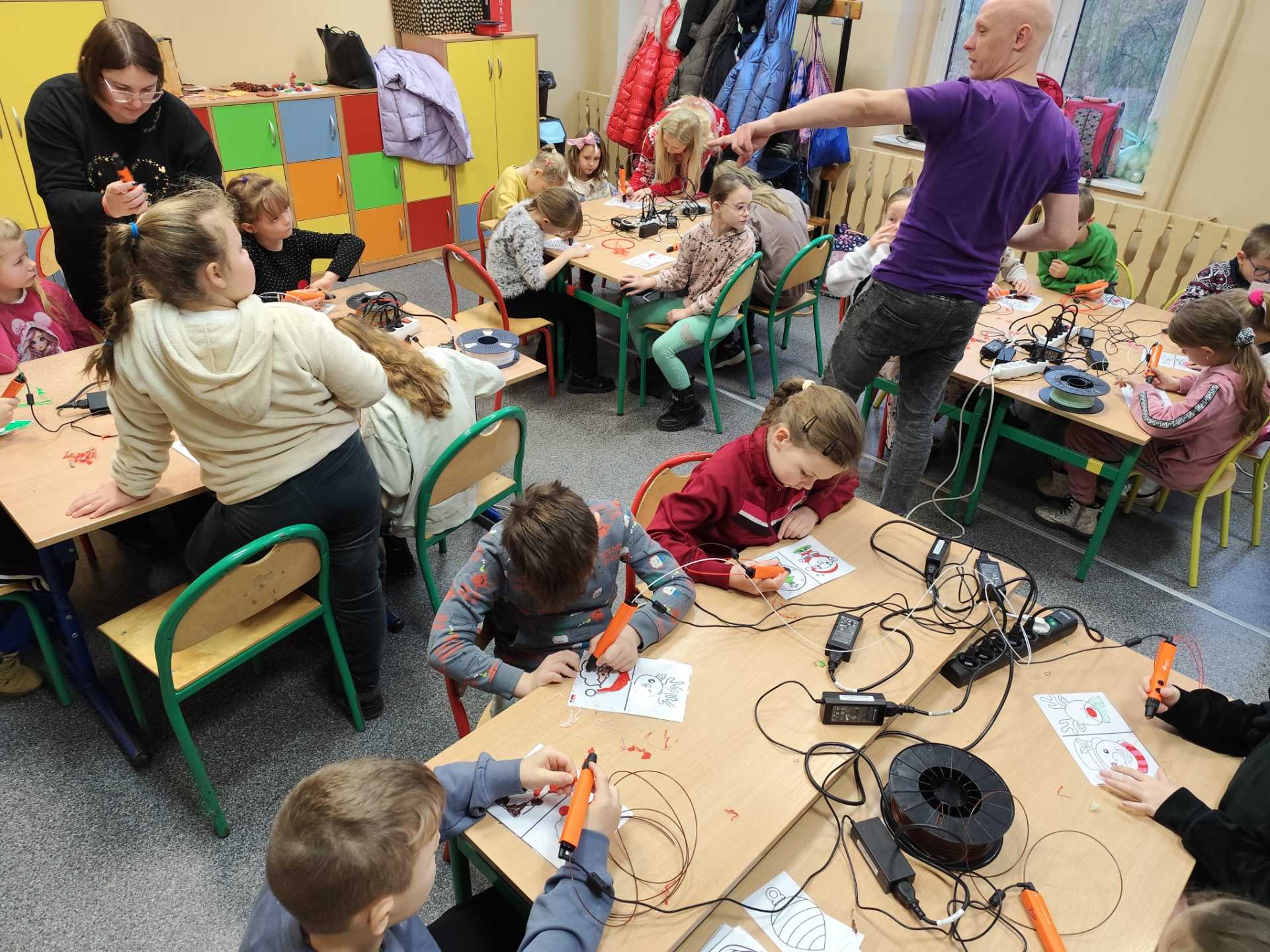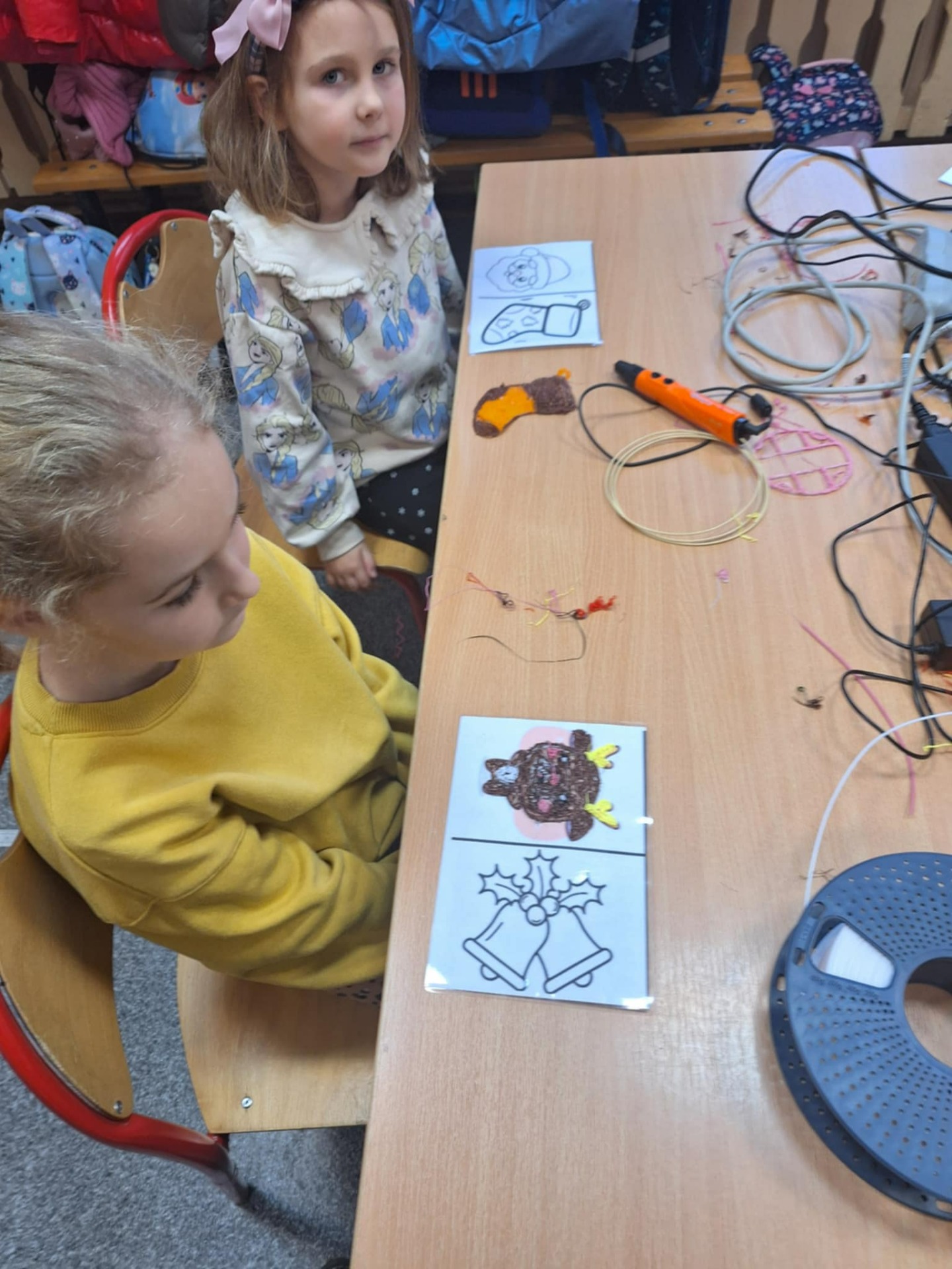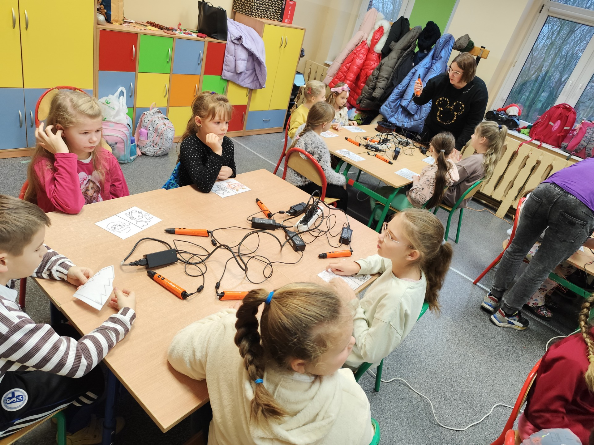 12 grudnia uczniowie klas 1- 4 na zaproszenie Gminnej Biblioteki Publicznej w Mieleszynie wzięli udział w warsztatach rysowania długopisami 3D, które były przeprowadzane przez ZiP Zabawa i Programowanie. Dzieci tworzyły wzory o tematyce świątecznej. Podczas warsztatów rozwijały swoją kreatywność i wyobraźnię. Uczyły się także staranności i cierpliwości. Udane wytwory m.in.: renifery, bombki, choinki, skrzaty były źródłem radości z pomyślnie wykonanych zadań.