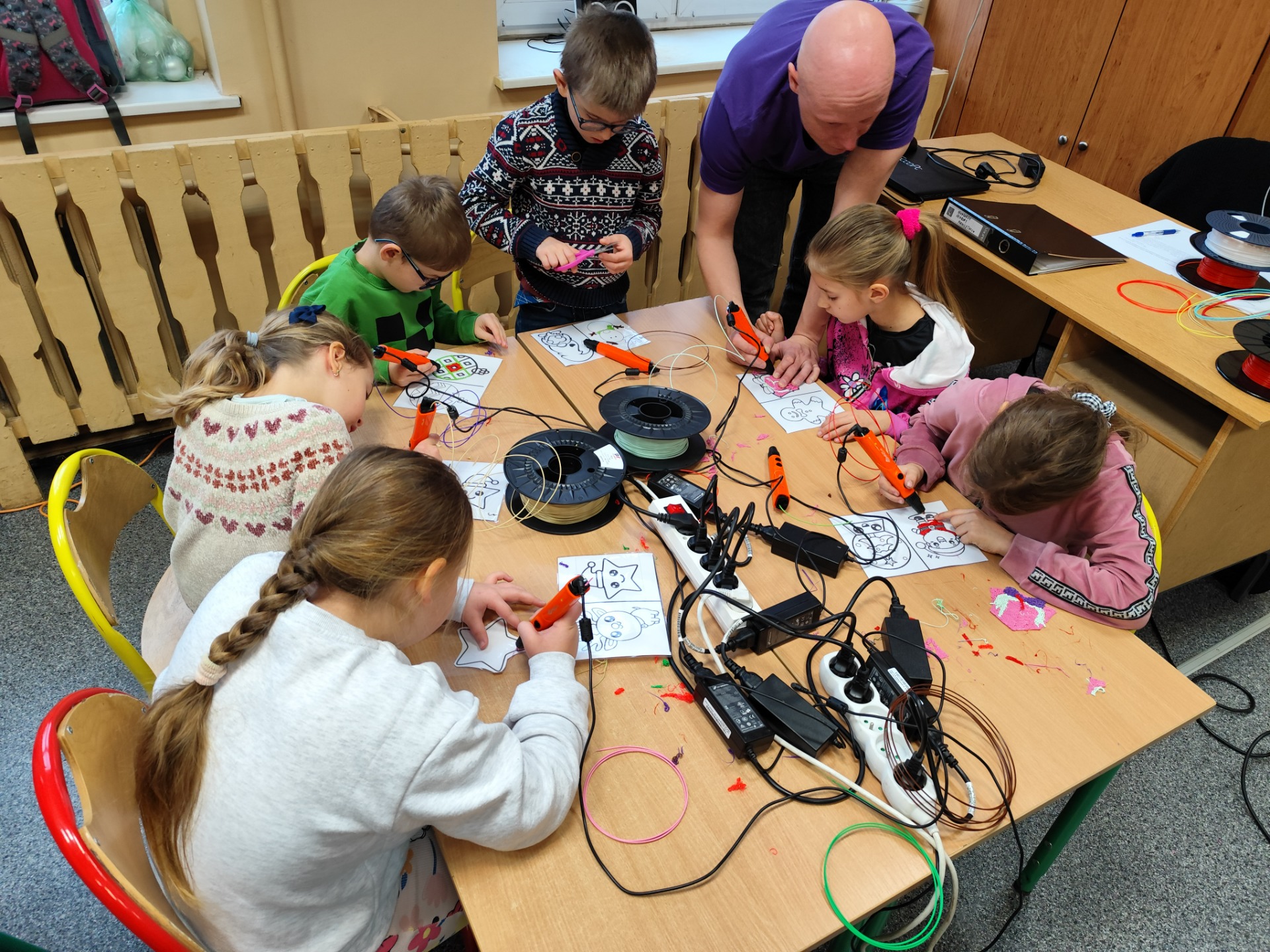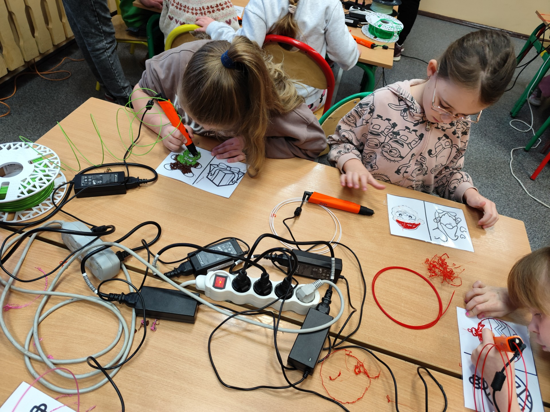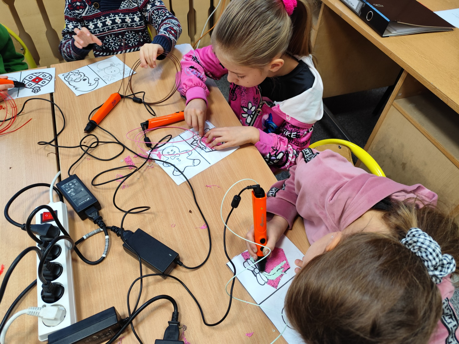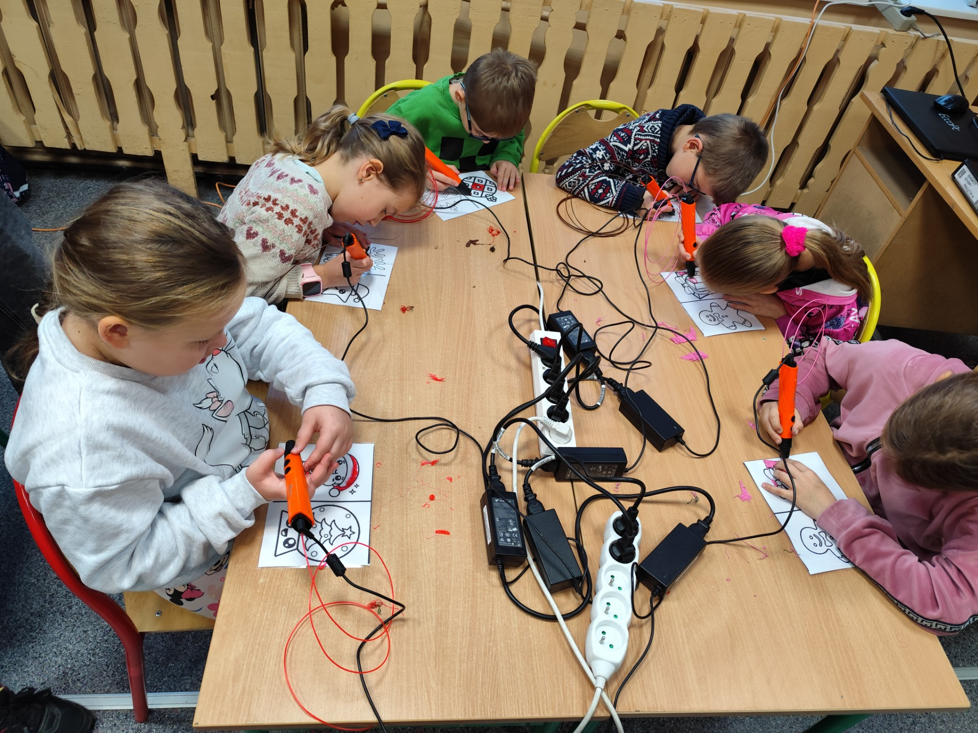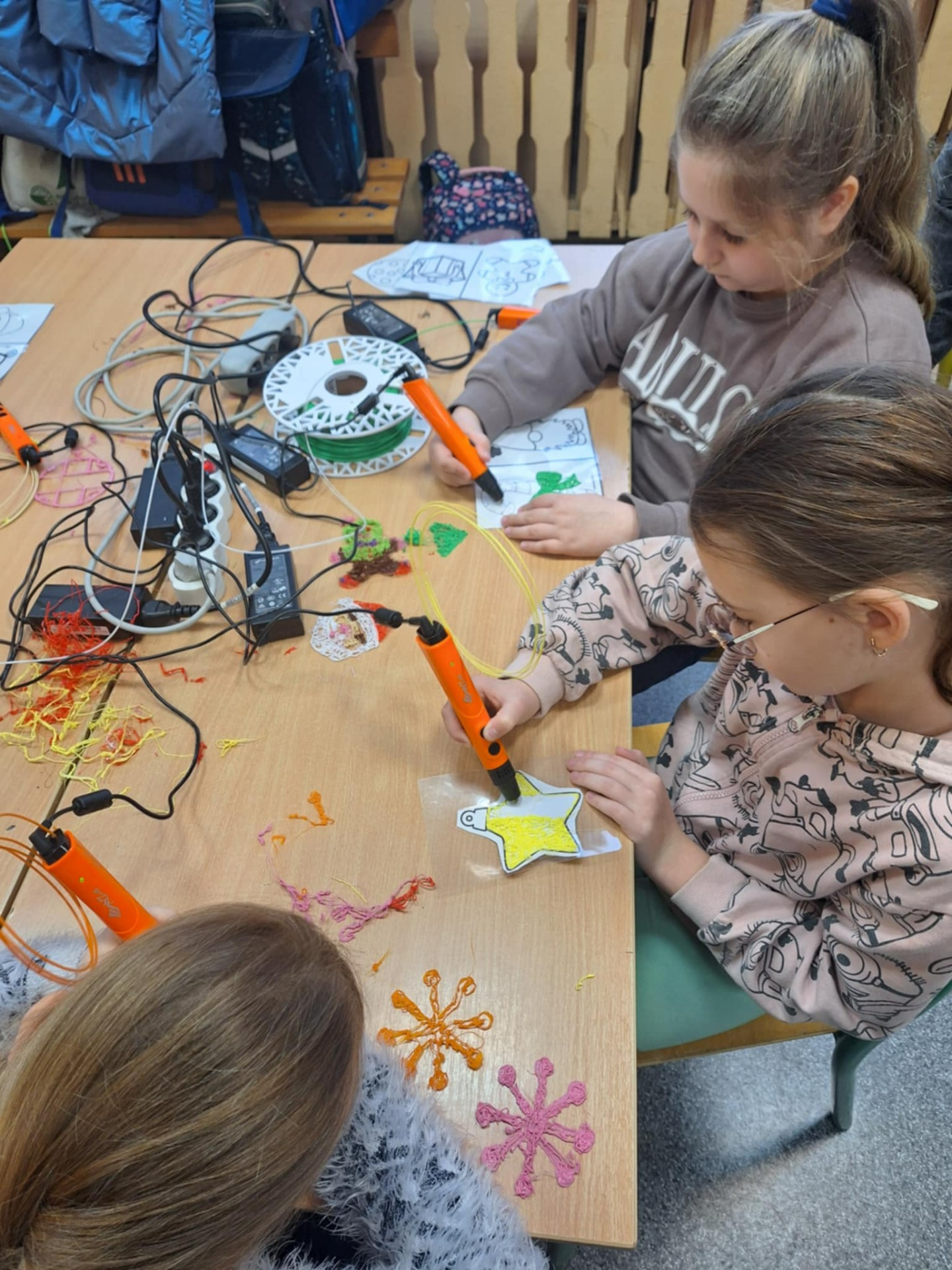 12 grudnia uczniowie klas 1- 4 na zaproszenie Gminnej Biblioteki Publicznej w Mieleszynie wzięli udział w warsztatach rysowania długopisami 3D, które były przeprowadzane przez ZiP Zabawa i Programowanie. Dzieci tworzyły wzory o tematyce świątecznej. Podczas warsztatów rozwijały swoją kreatywność i wyobraźnię. Uczyły się także staranności i cierpliwości. Udane wytwory m.in.: renifery, bombki, choinki, skrzaty były źródłem radości z pomyślnie wykonanych zadań.