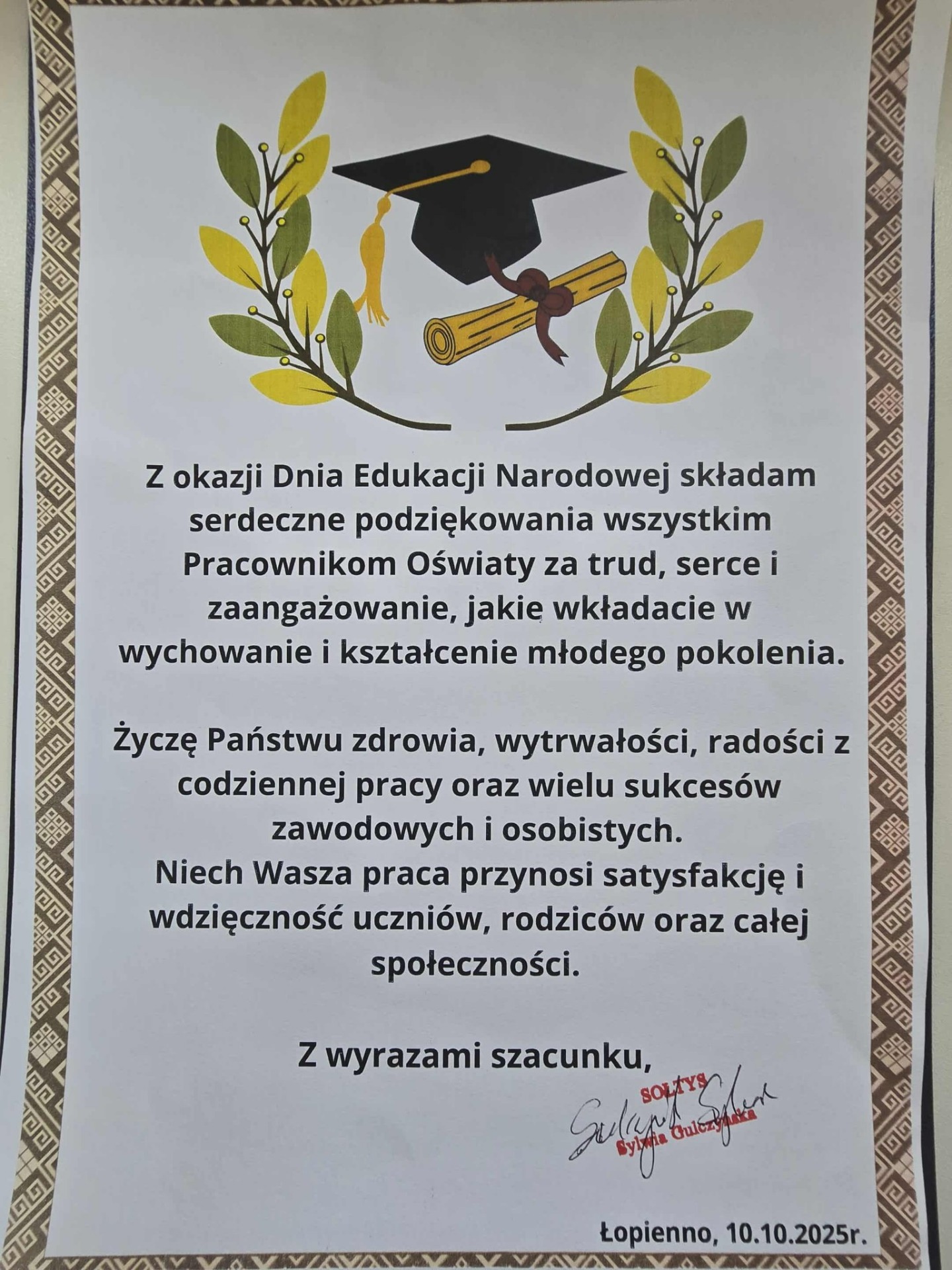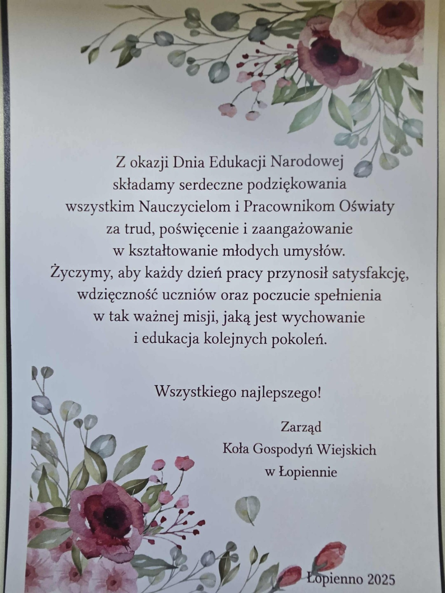 Dzień Edukacji Narodowej obchodzimy zawsze uroczyście. Wszystkim gościom serdecznie dziękujemy za przybycie na szkolną akademię. Dziękujemy Pani S. Gulczyńskiej Sołtys Łopienna oraz Zarządowi KGW w Łopiennie - za pamięć i piękne laurki wyrażające ciepłe słowa