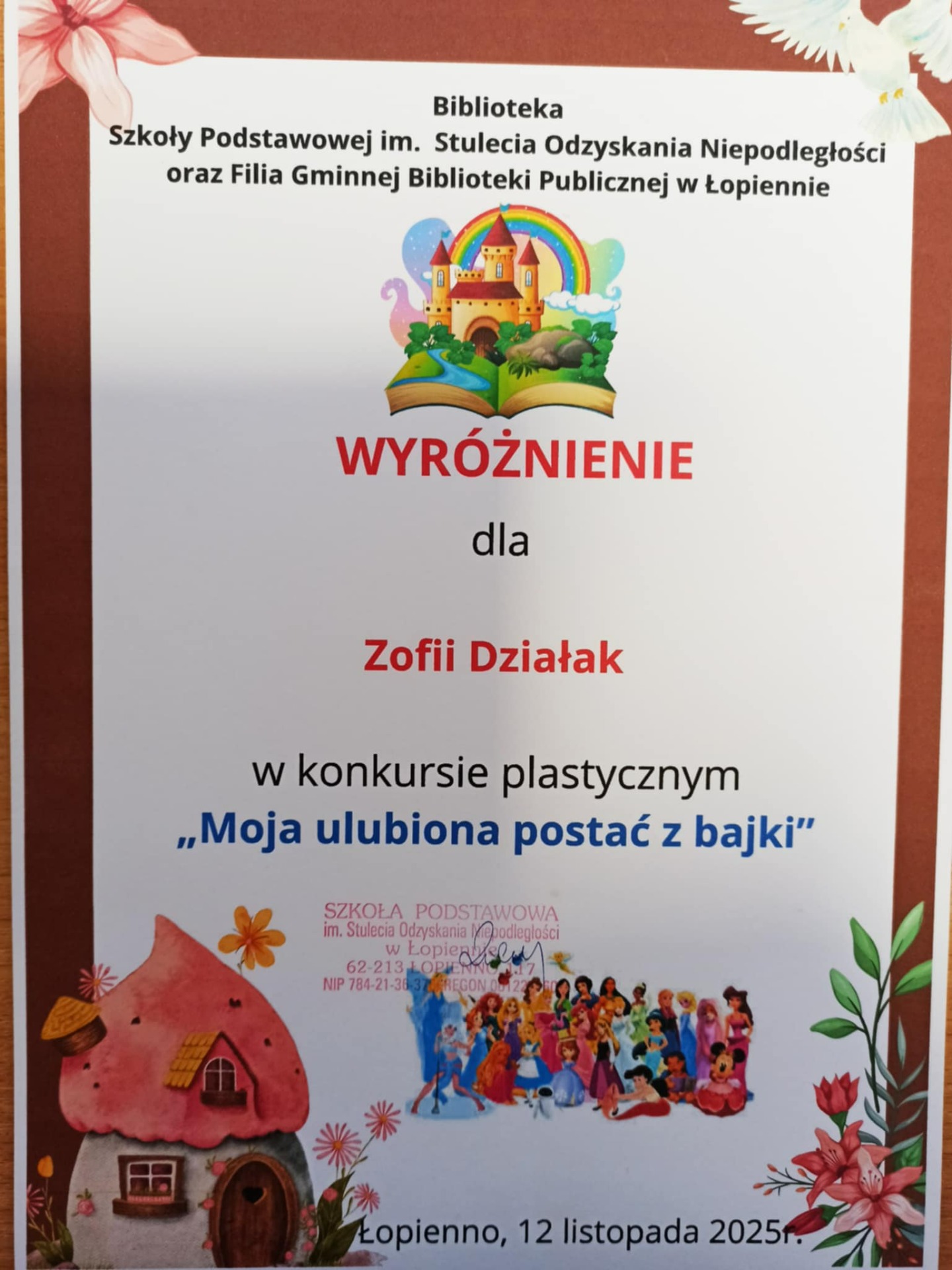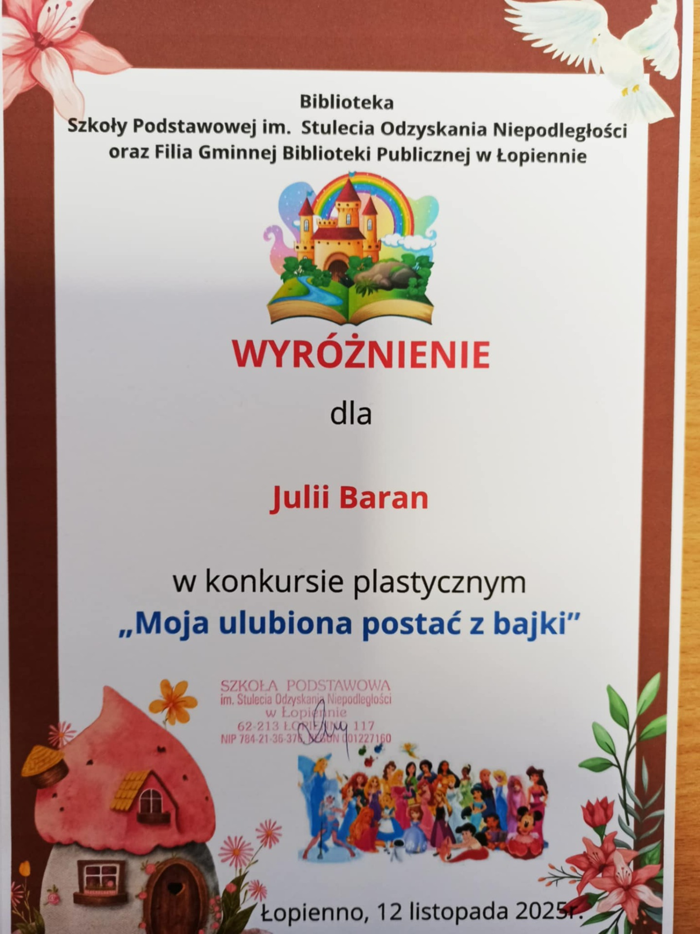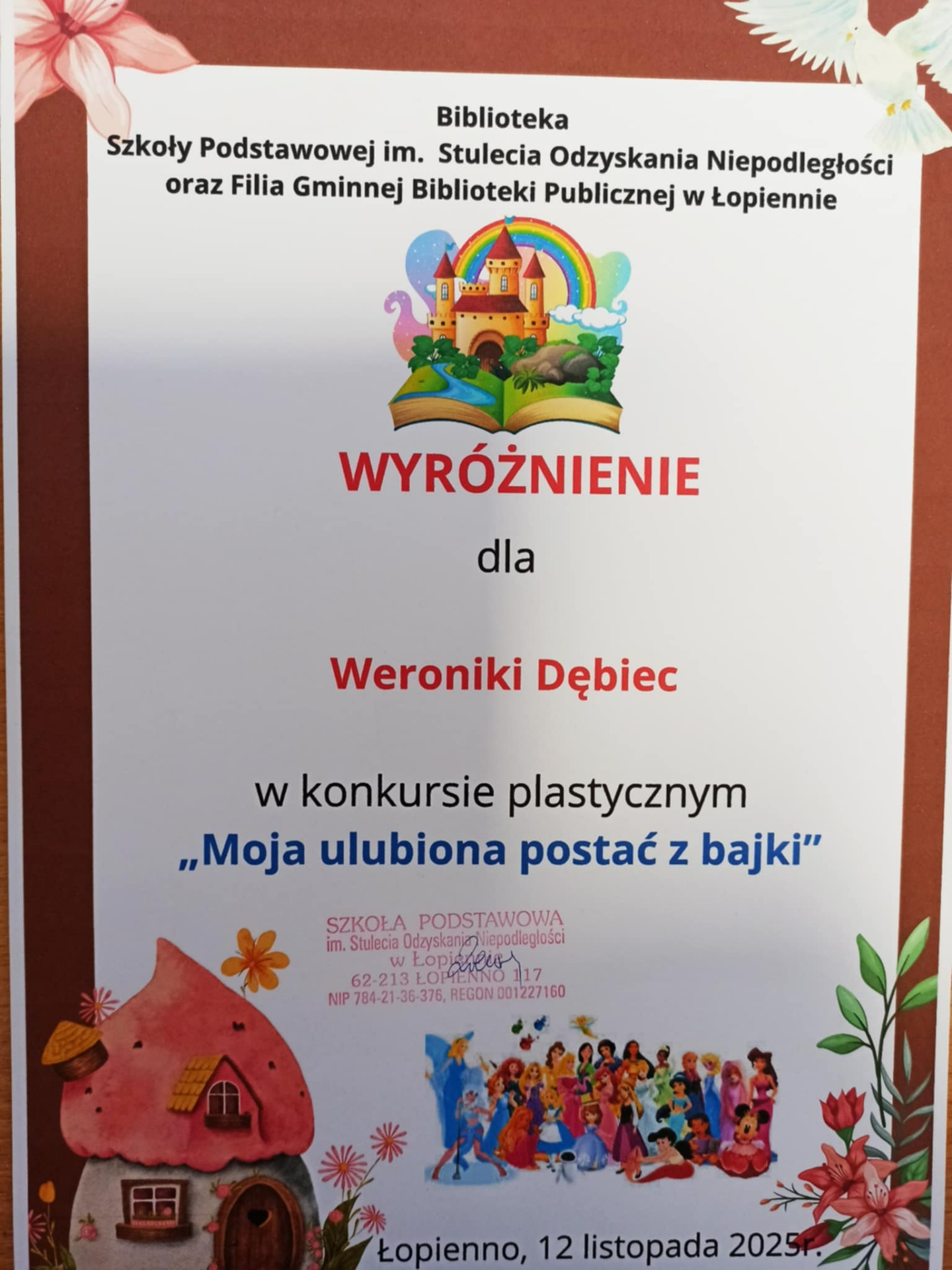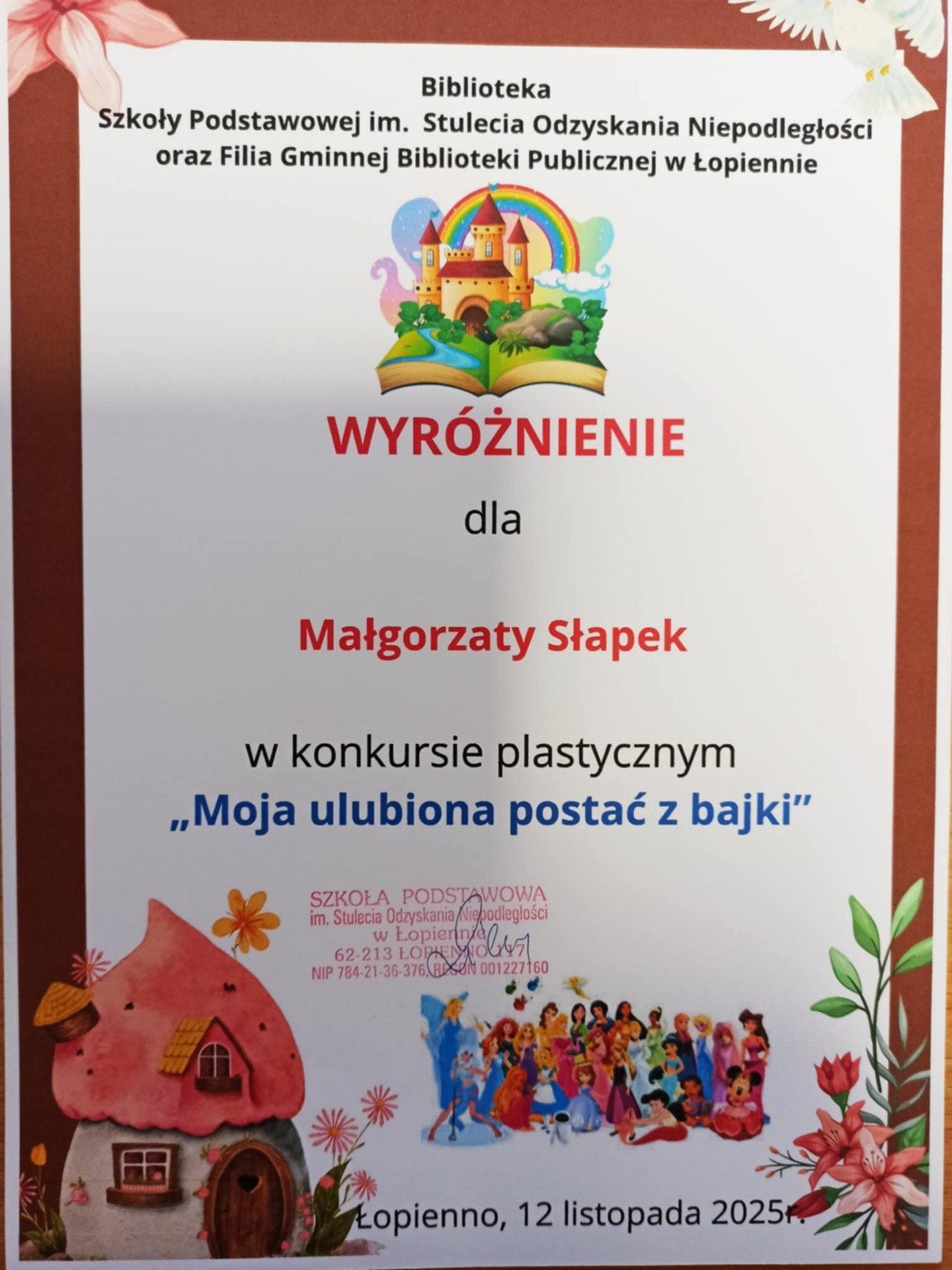 W dniu dzisiejszym odbyło się spotkanie podsumowujące konkurs plastyczny pt. "Moja ulubiona postać z bajki", którego organizatorem była Biblioteka Szkoły Podstawowej im. Stulecia Odzyskania Niepodległości w Łopiennie oraz Filia Gminnej Biblioteki Publicznej w Łopiennie. Nagrodzono wyróżniające się prace oraz wszystkich uczestników konkursu. Gratulujemy!😍