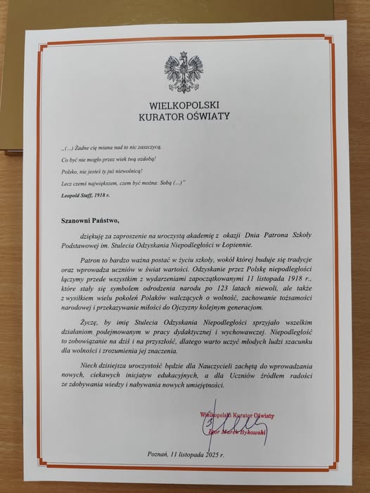Dziękujemy st. wizytator Kuratorium Oświaty w Poznaniu P. Katarzynie Kurczoba za obecność na uroczystości z okazji Narodowego Święta Niepodległości Polski i Dnia Patrona SP im. Stulecia Odzyskania Niepodległości w Łopiennie oraz przekazane upominki.